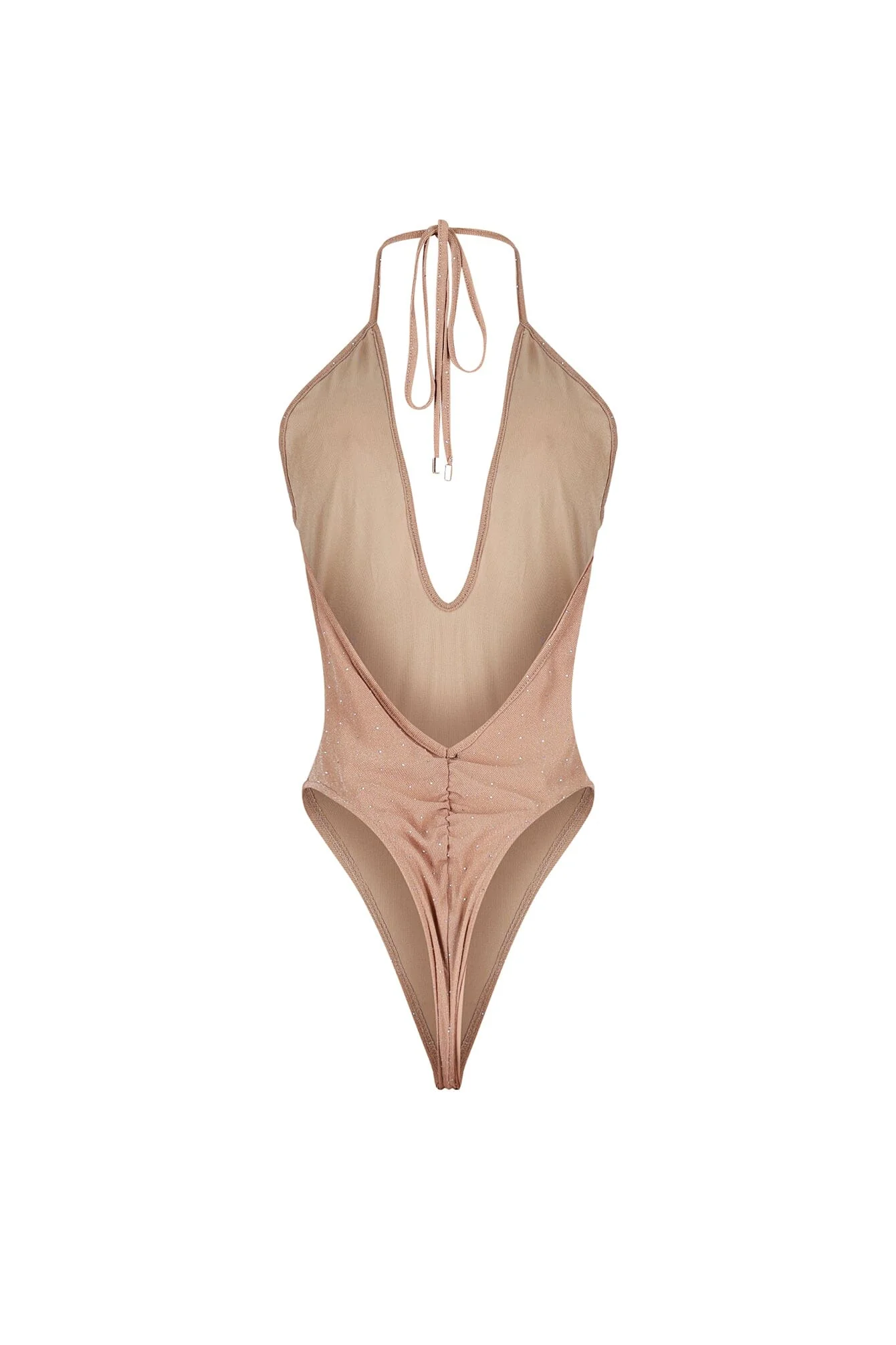Mesh halter neck bodysuit featuring a deep U neckline and all over rhinestone detailing