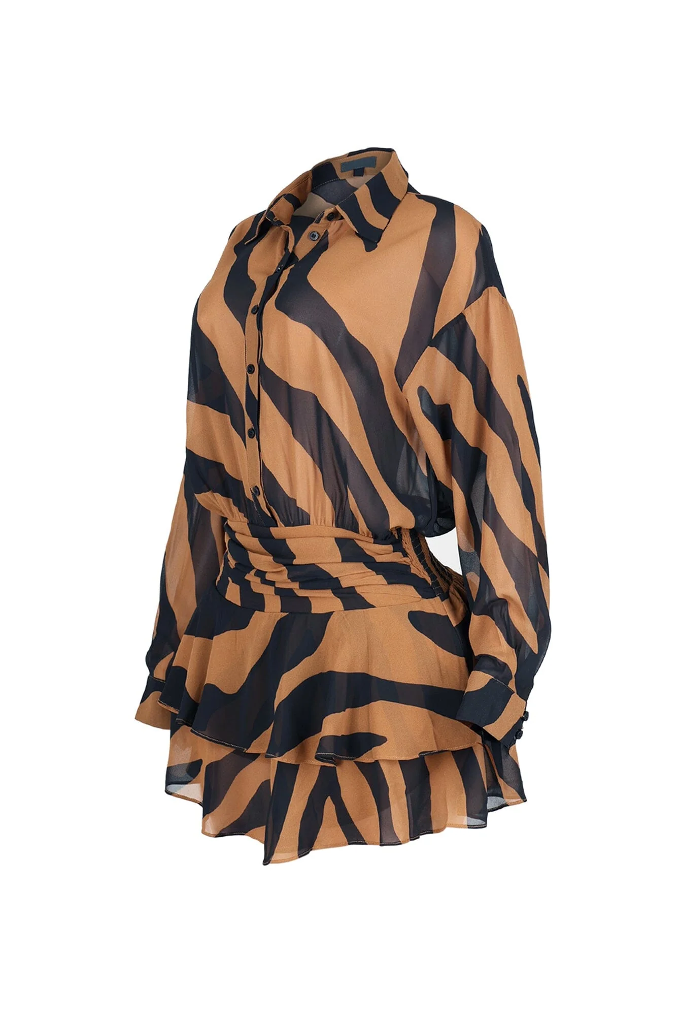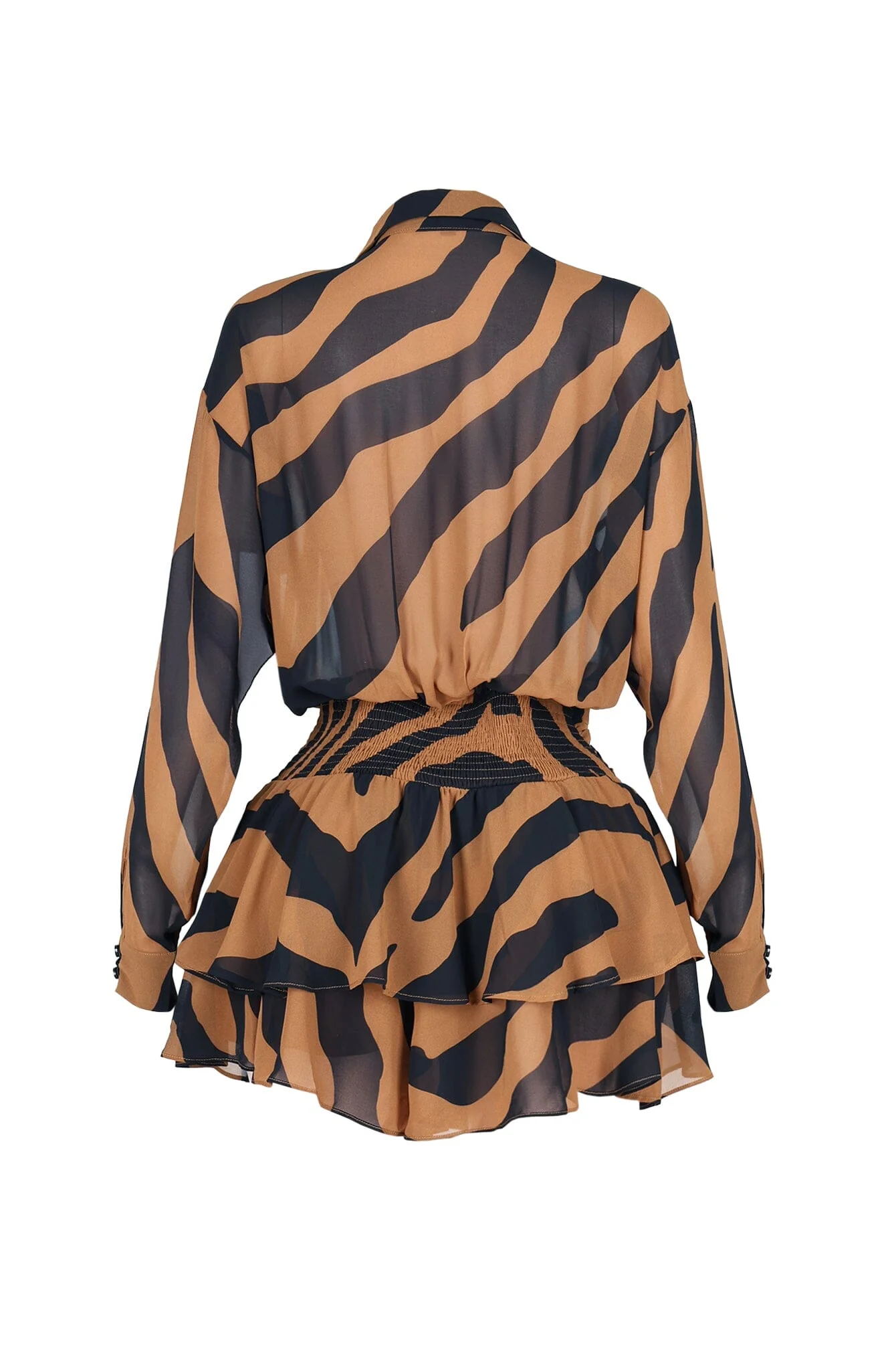 Zebra printed romper featuring collared long sleeves and a layered ruffle hemline