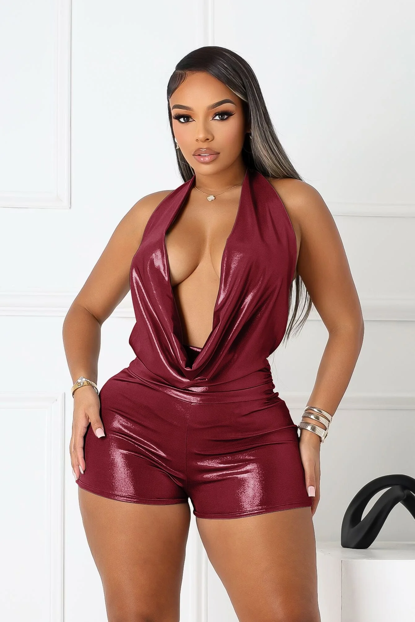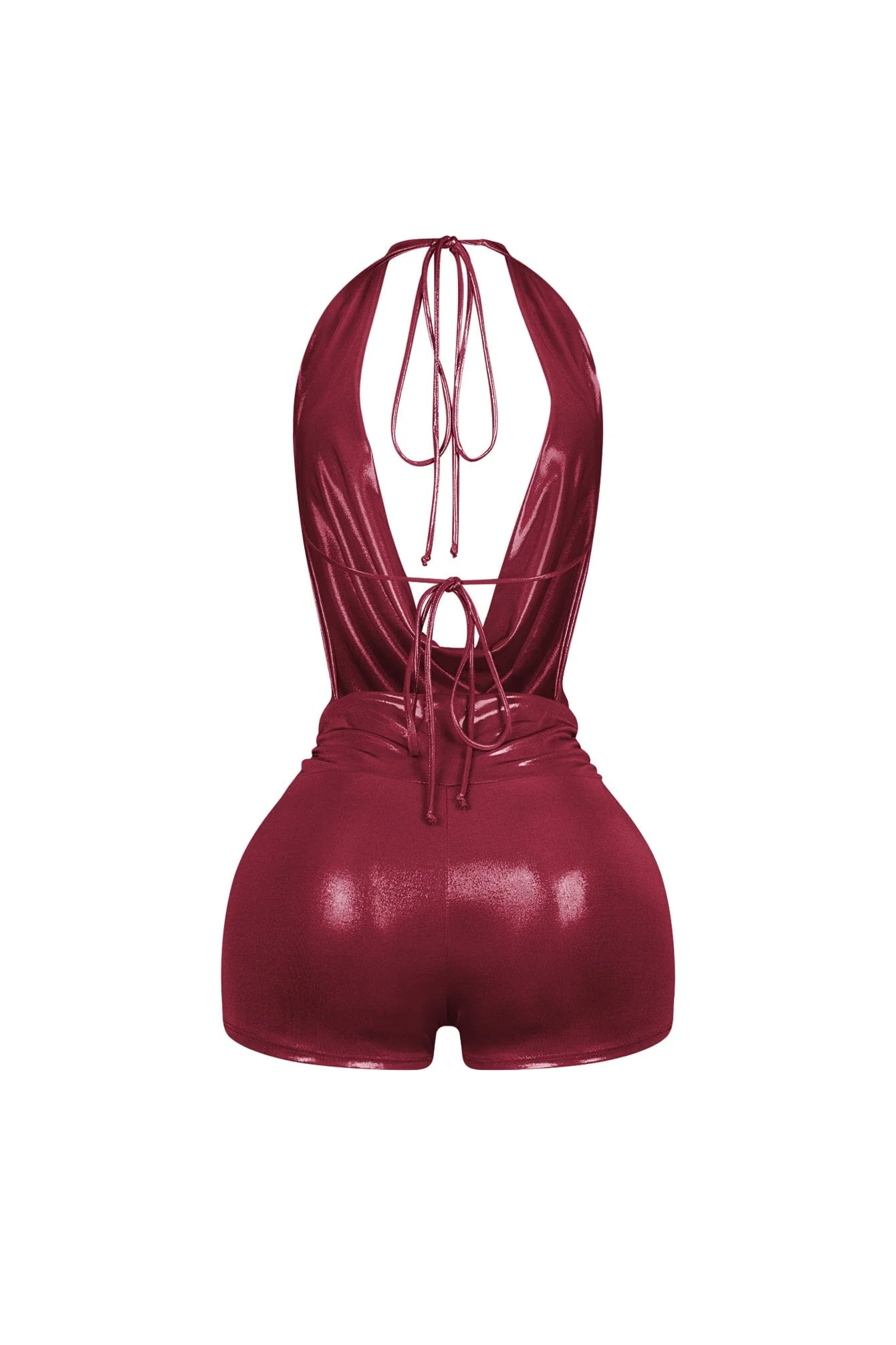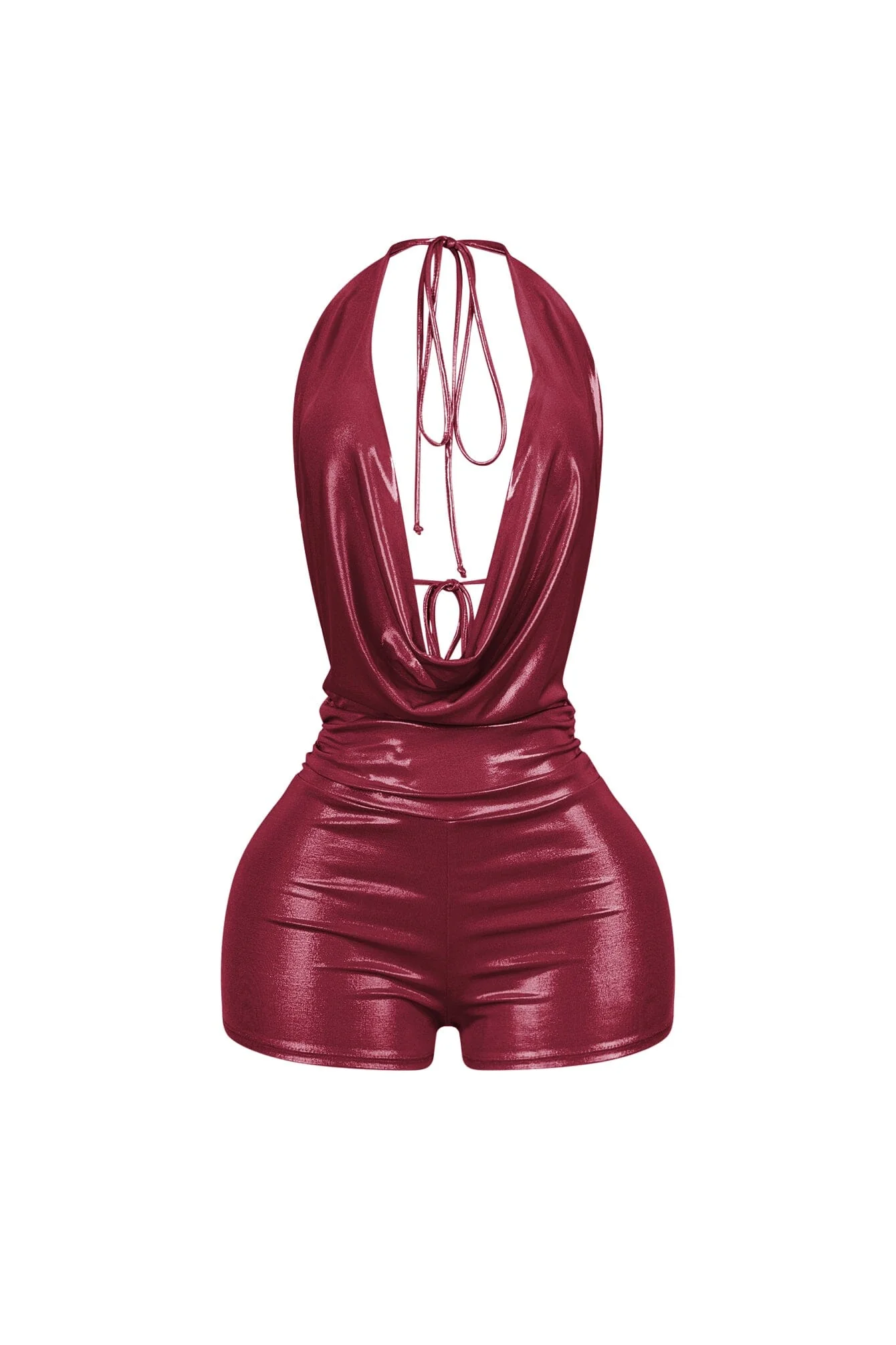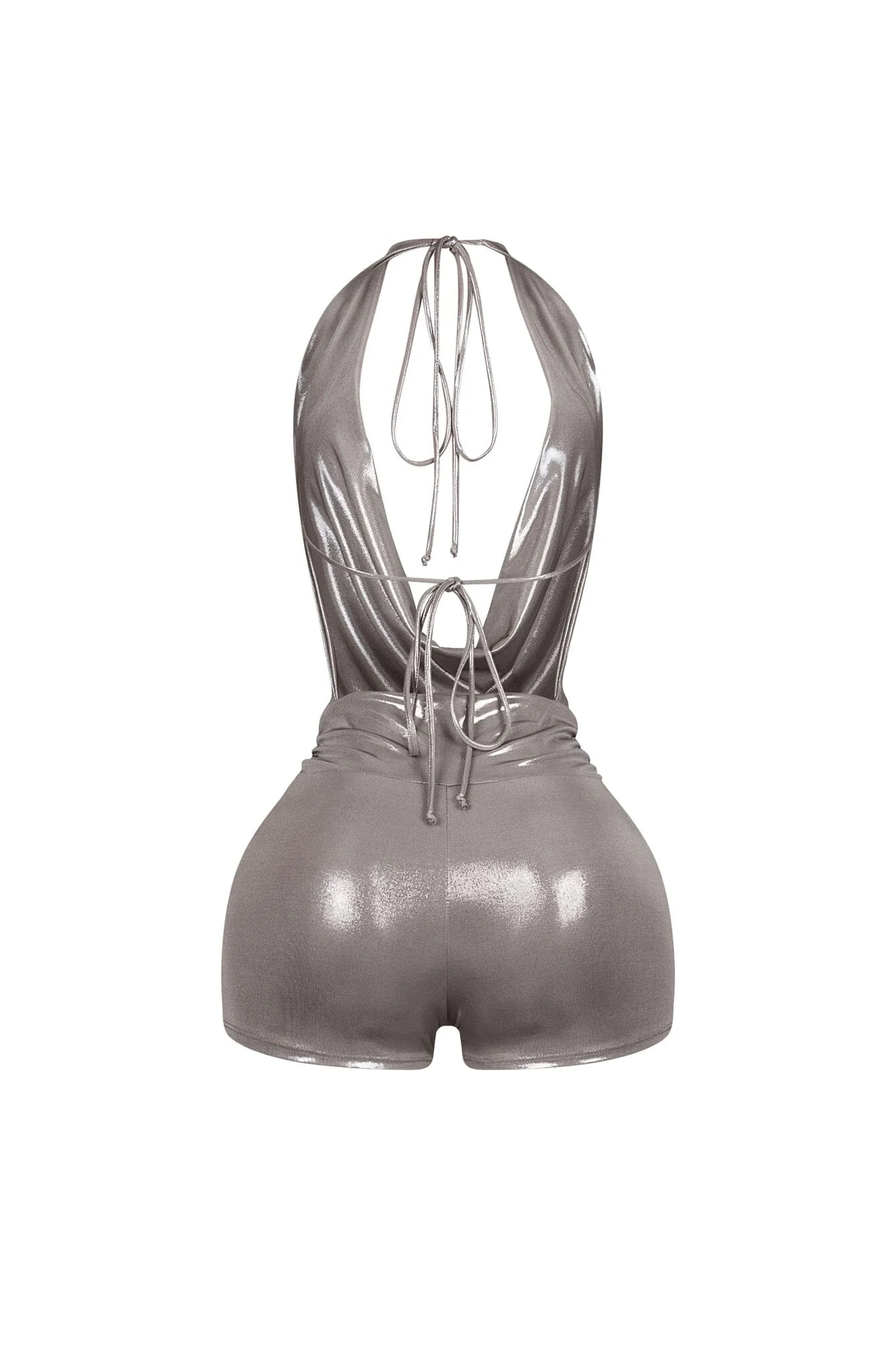 Sleeveless foil cowl neck romper featuring a draped cowl neckline and an open back design with a tie back closure