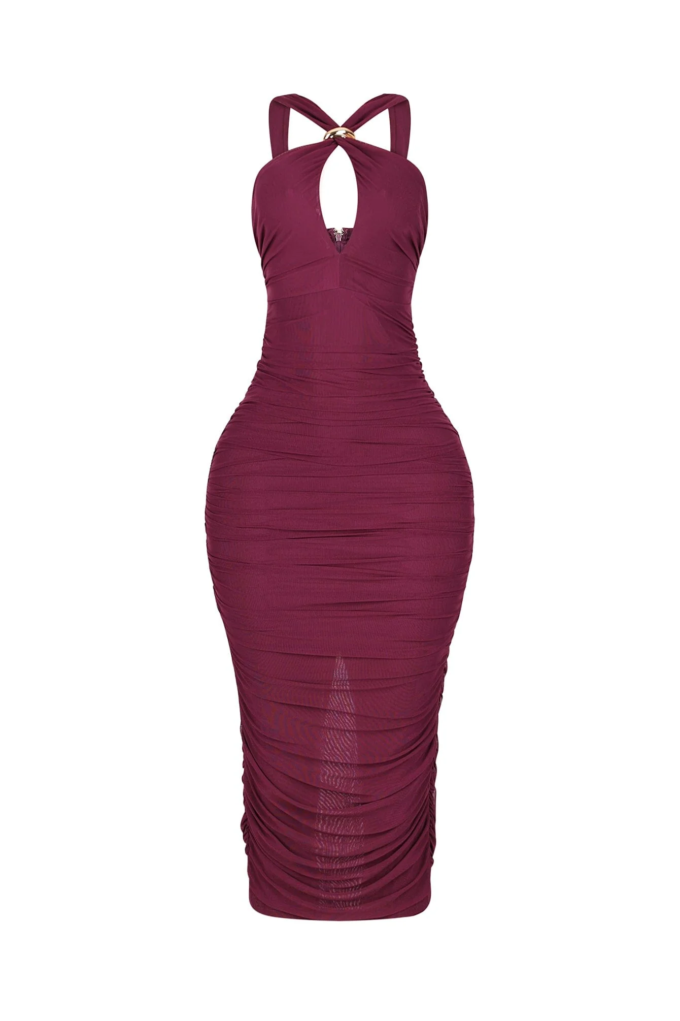 Mesh ruched tank midi dress featuring allover ruching and a cutout accented with metal detail
