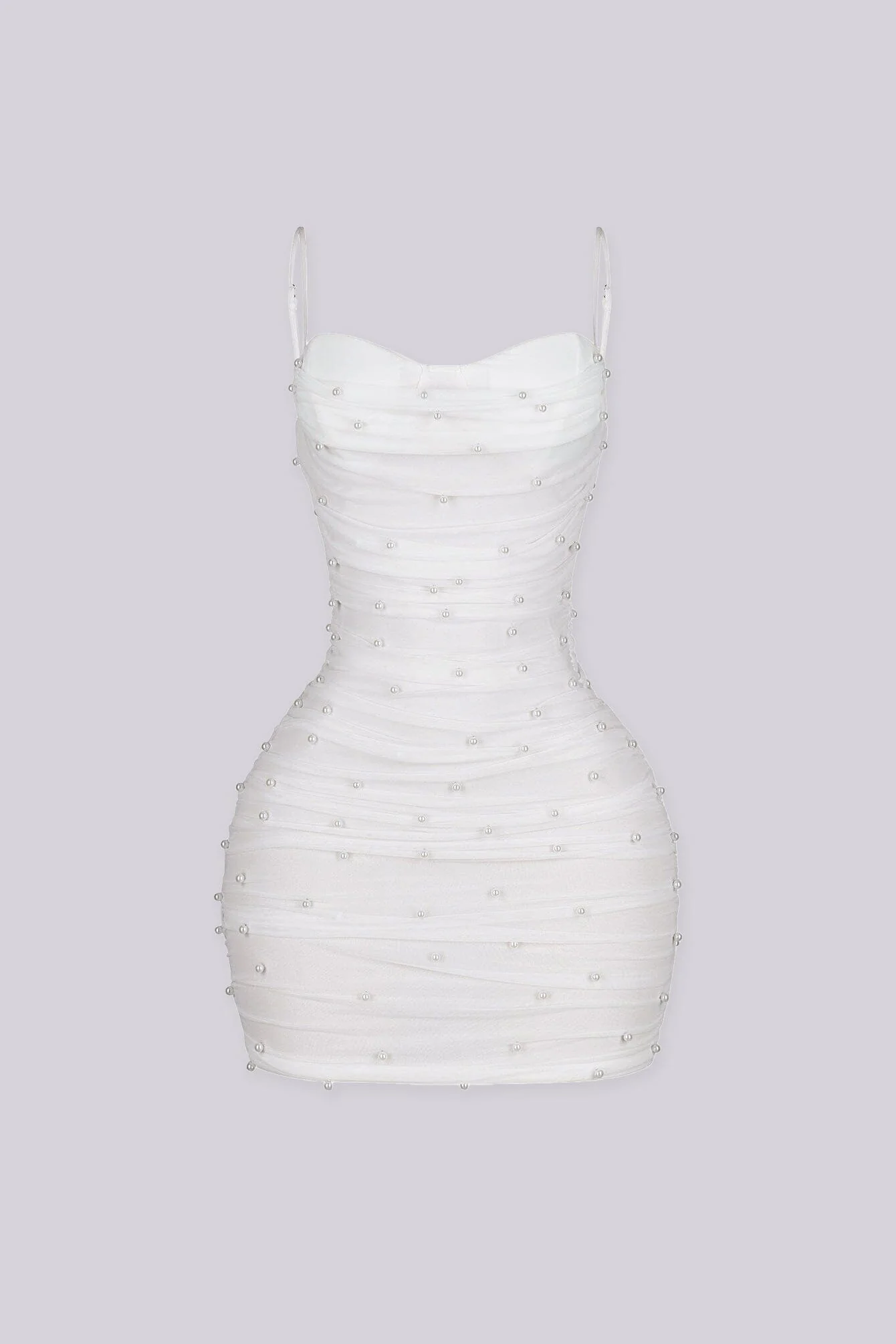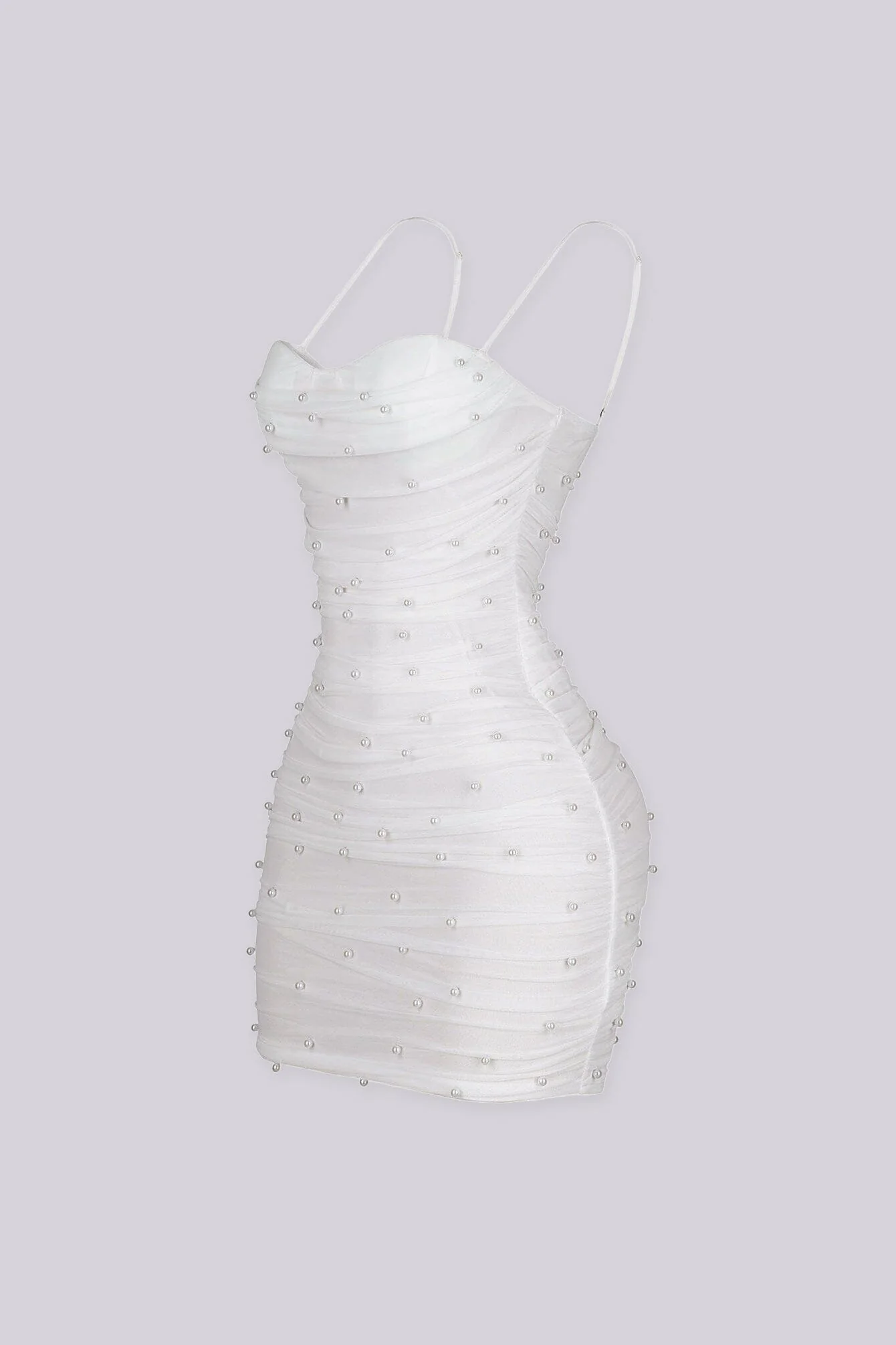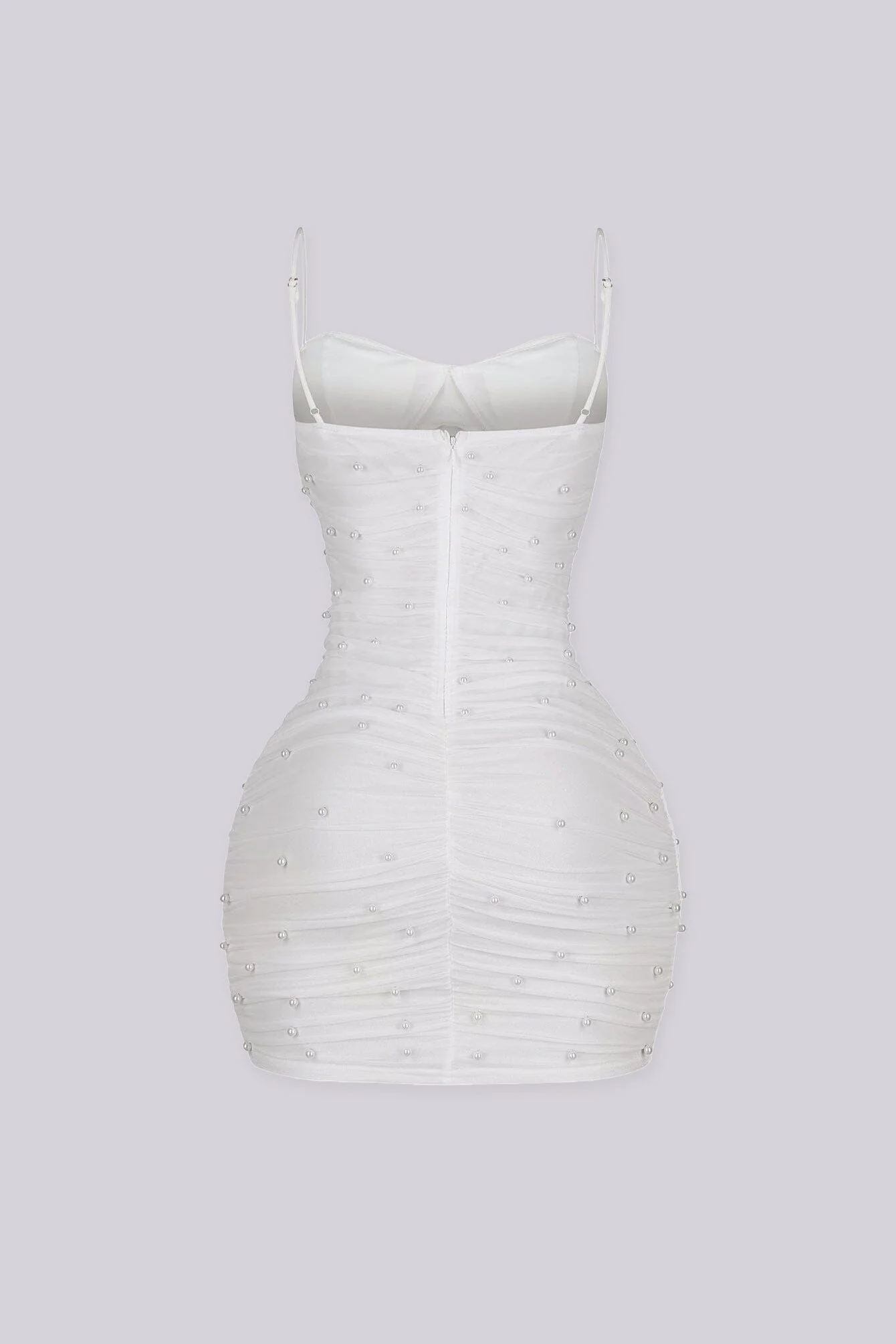 Sleeveless mesh mini dress featuring a padded bustier, pearl embellishments, and ruching details