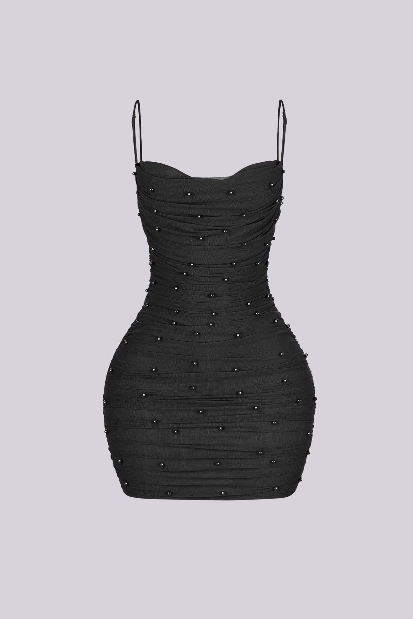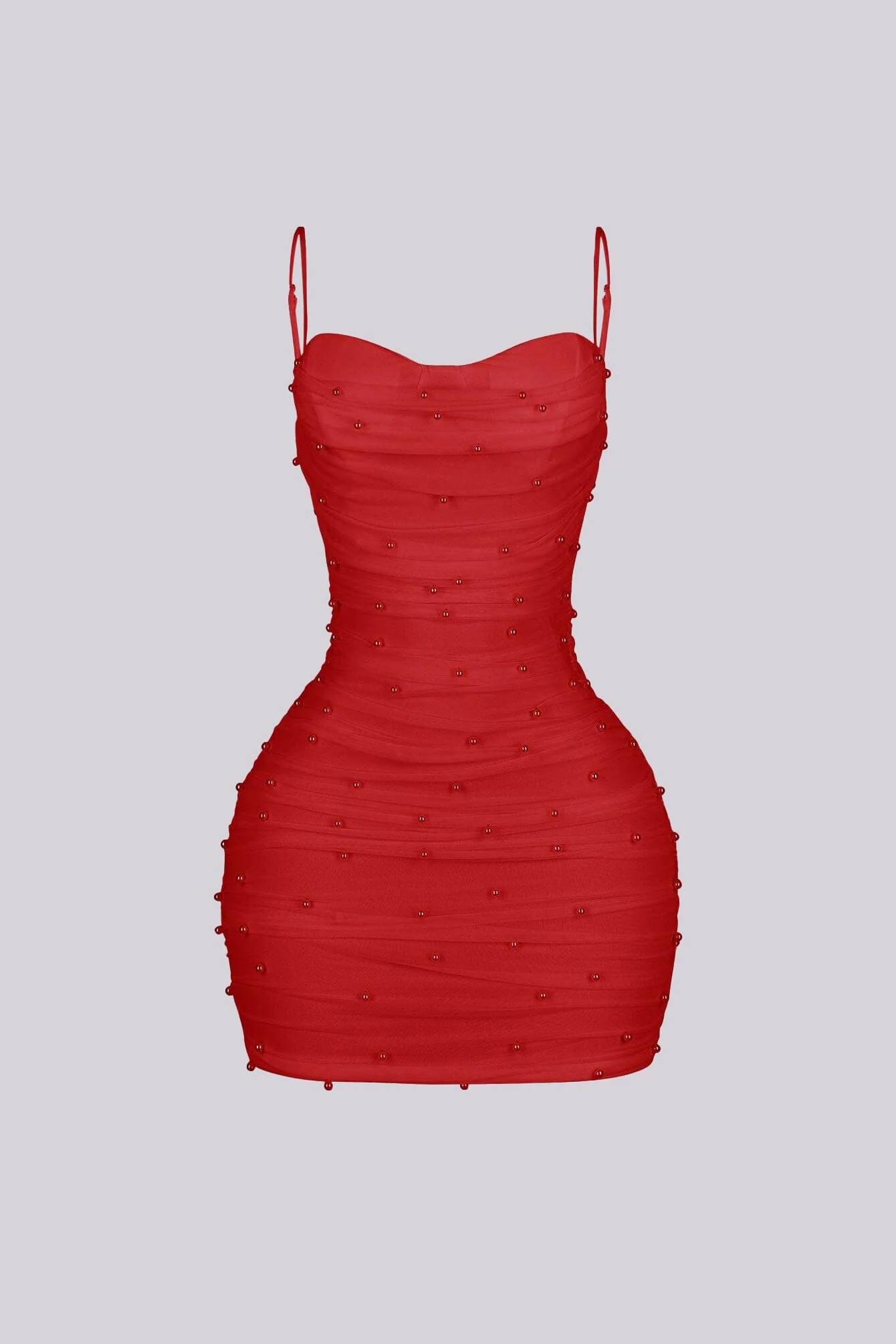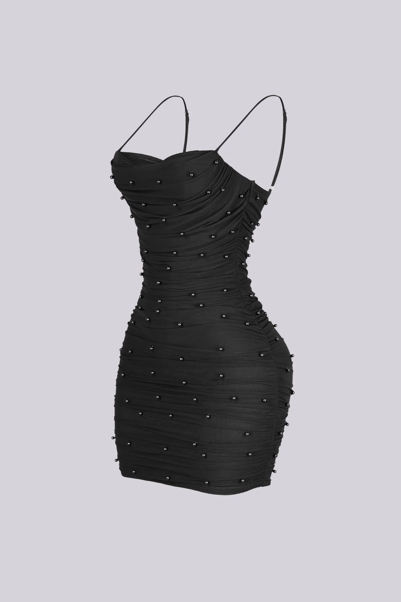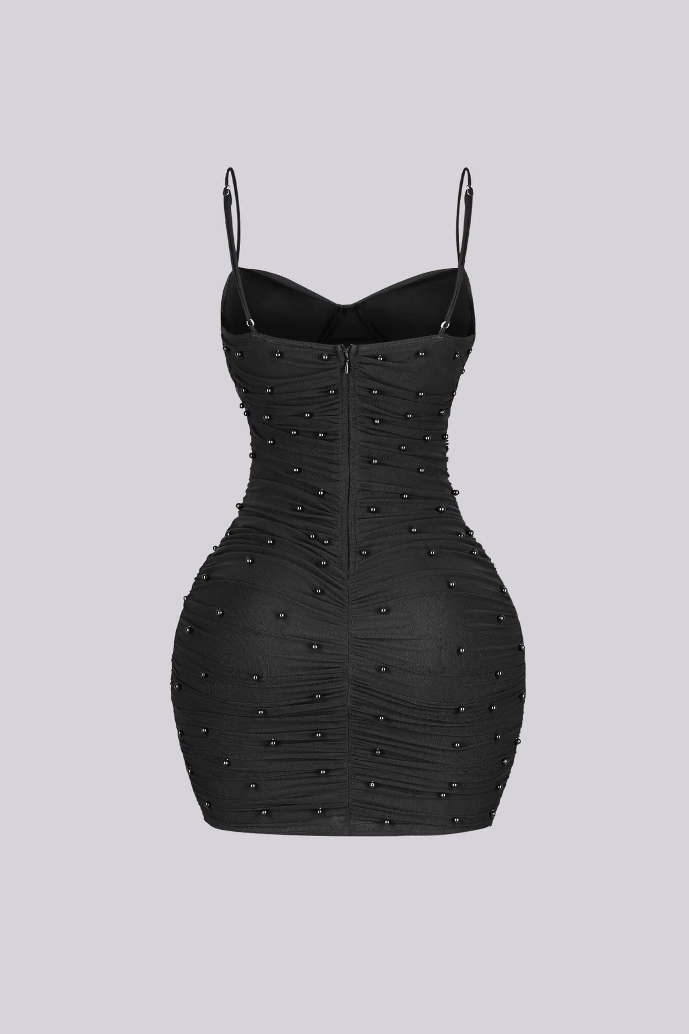 Sleeveless mesh mini dress featuring a padded bustier, pearl embellishments, and ruching details