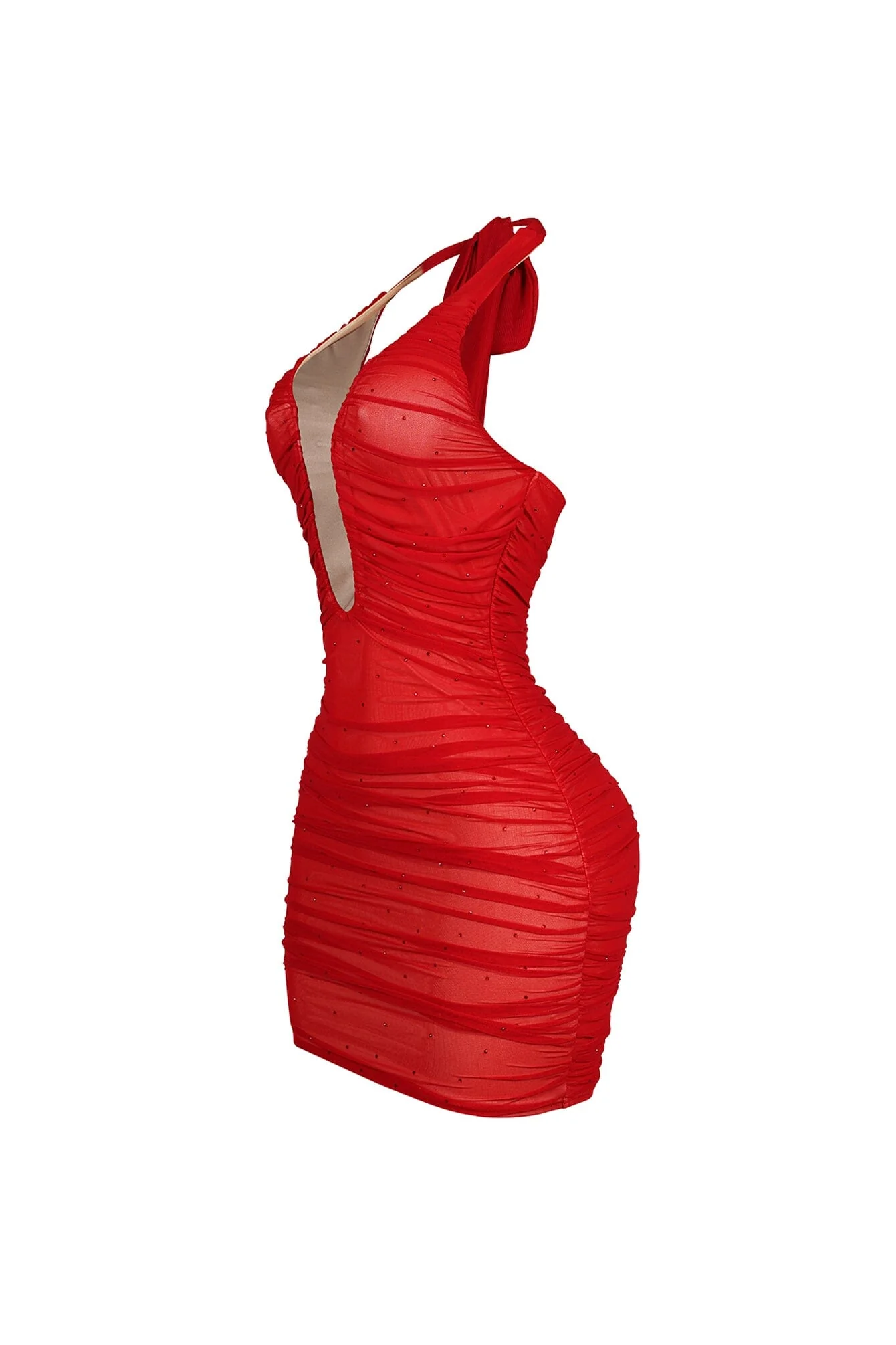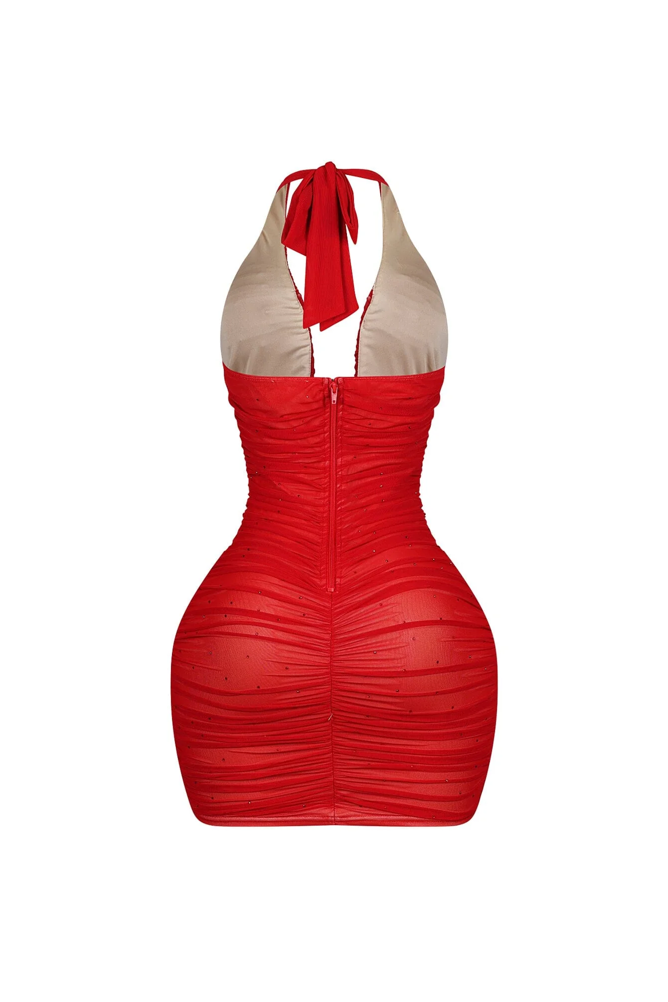 Mesh halter bustier mini dress featuring all over rhinestones, structured wiring, and ruching details