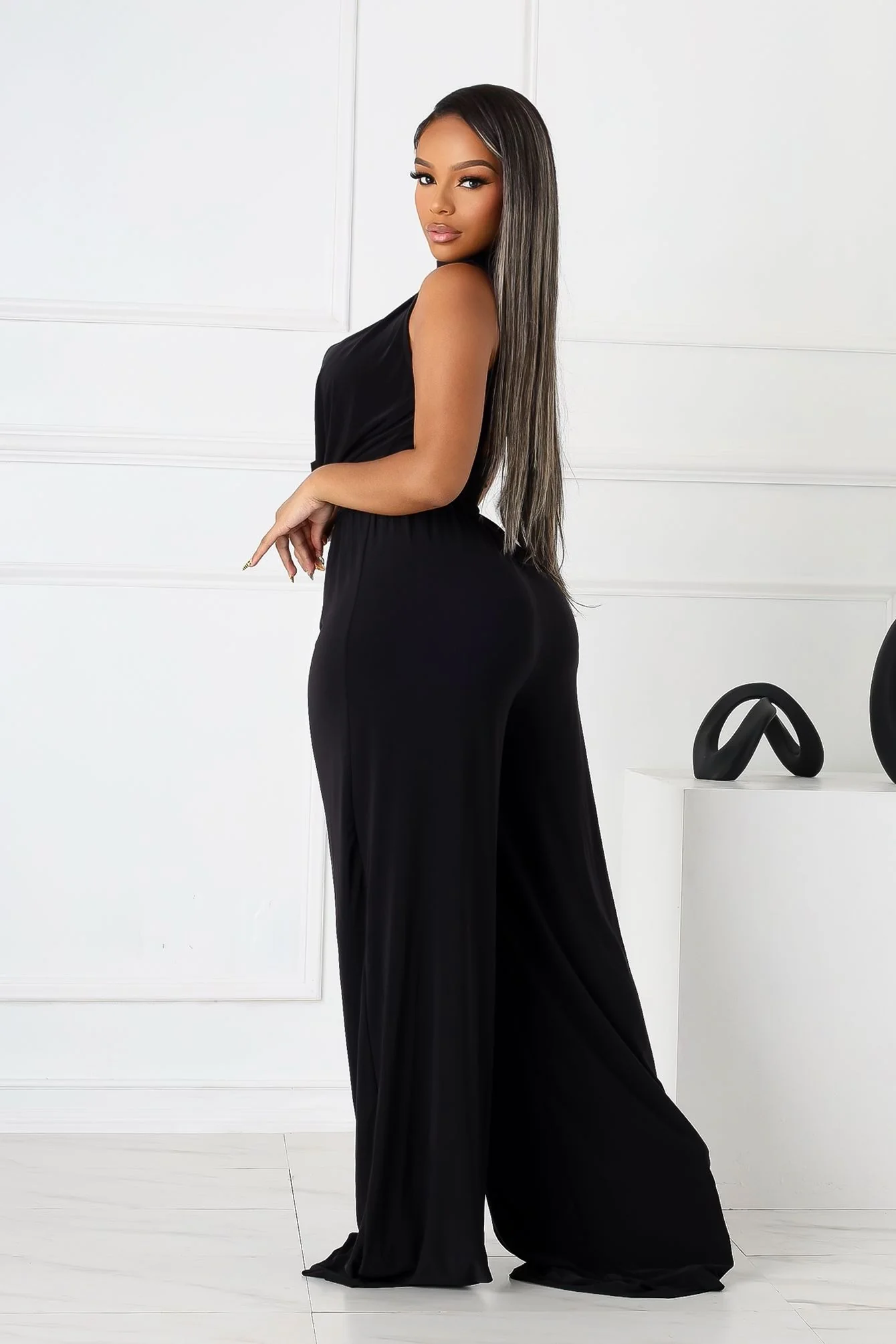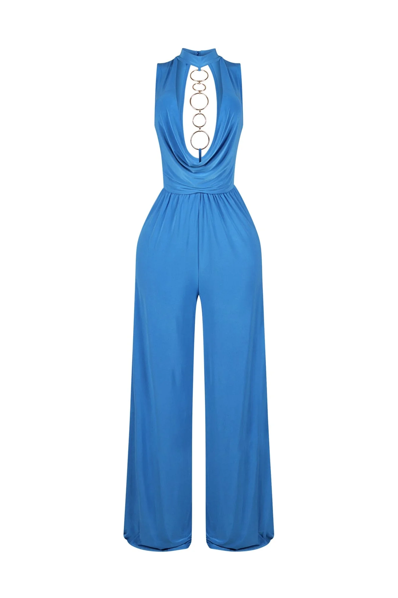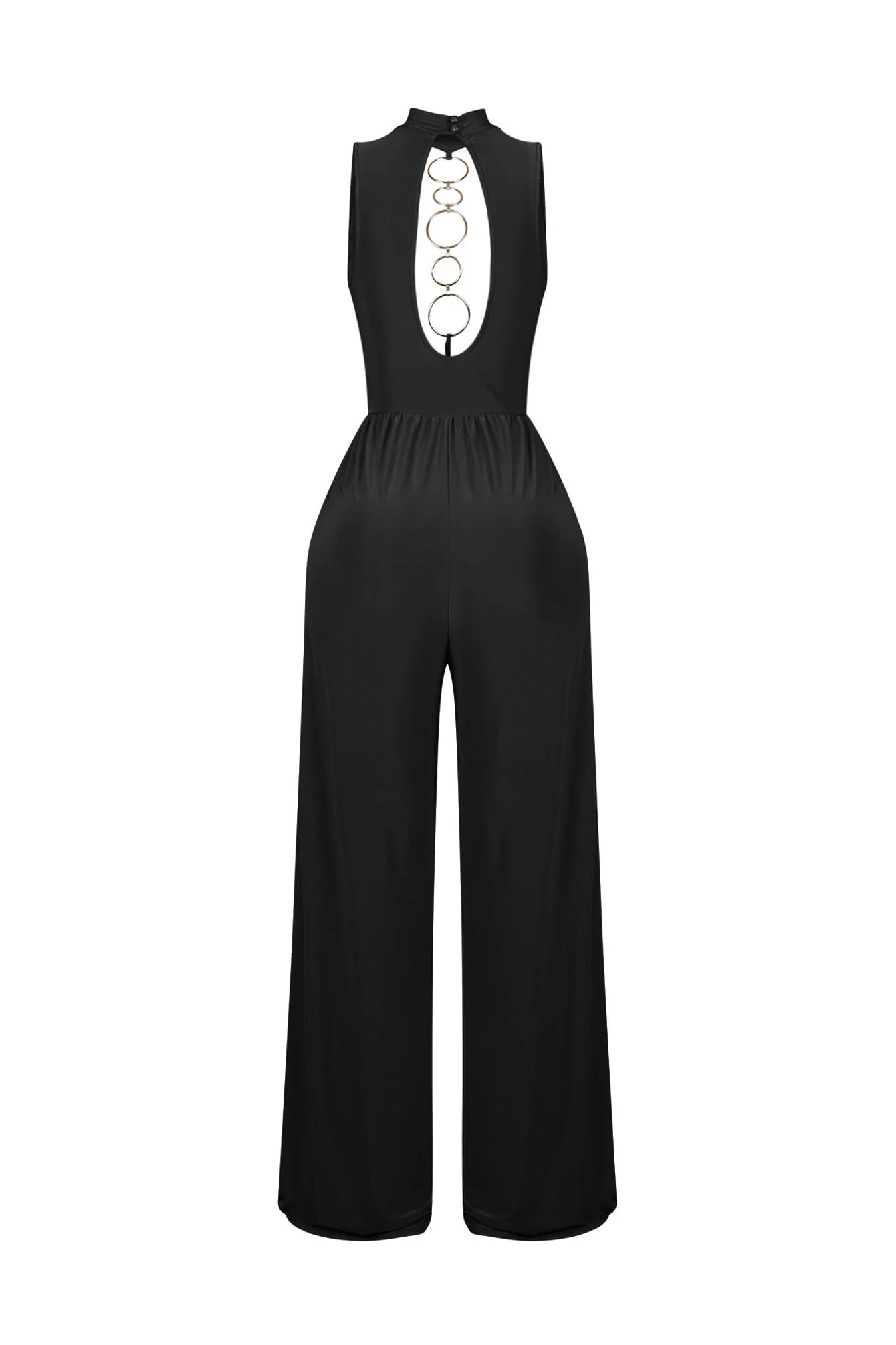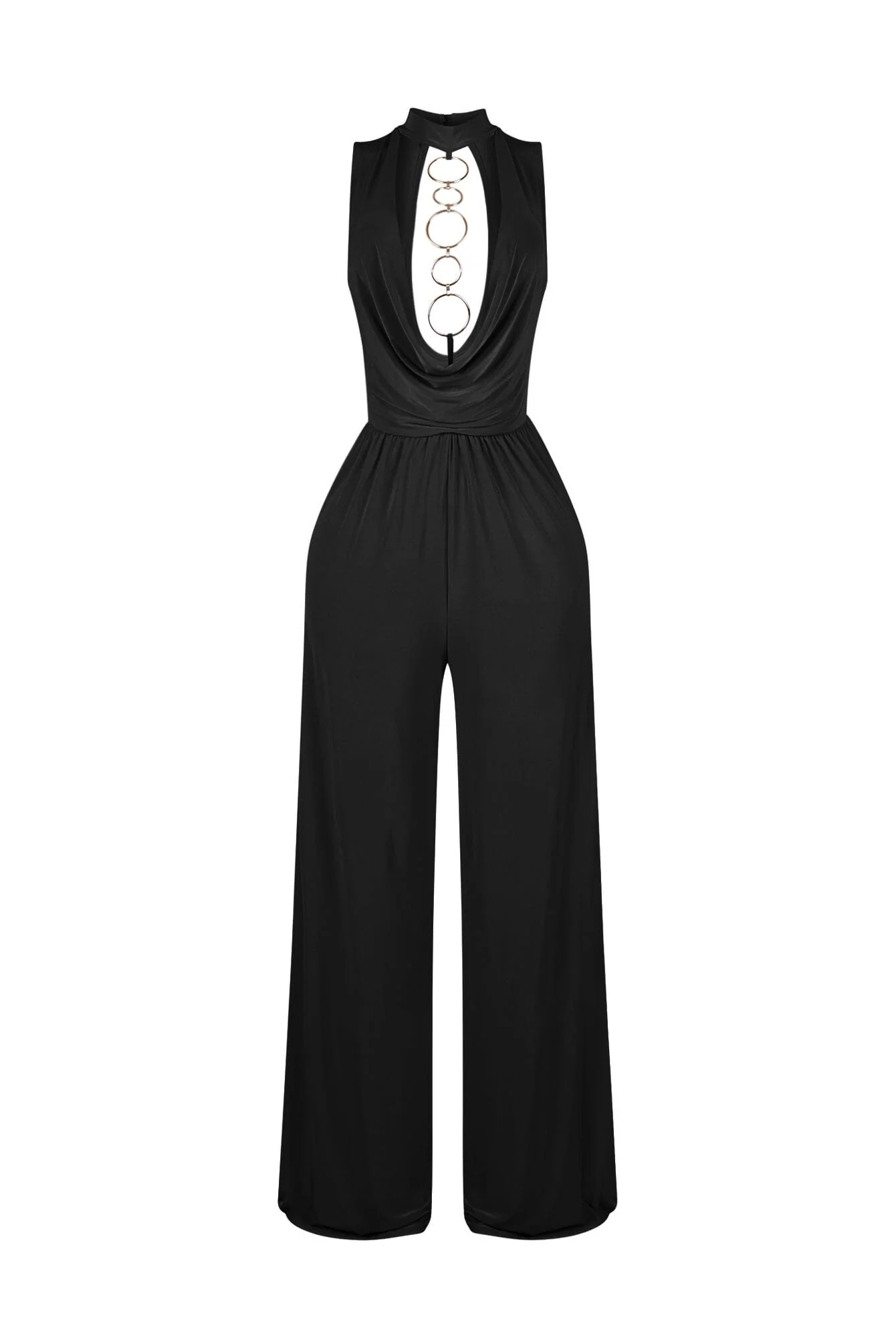 Mock cowl neck jumpsuit featuring gold circular metal trim at the front