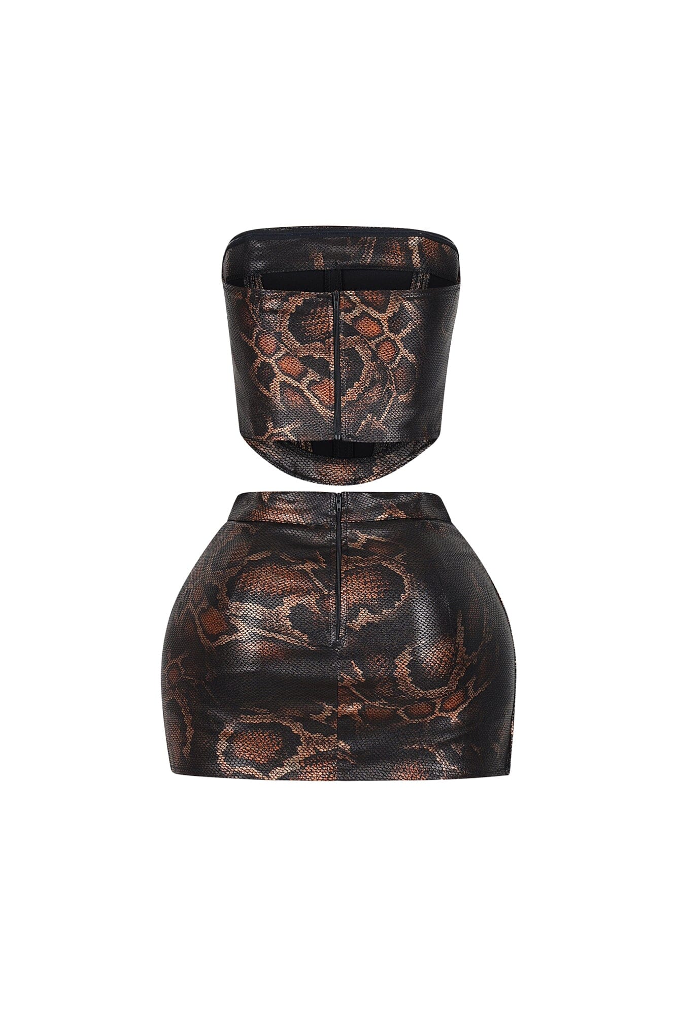 Animal print faux leather tube top featuring structured boning and inner gel tape