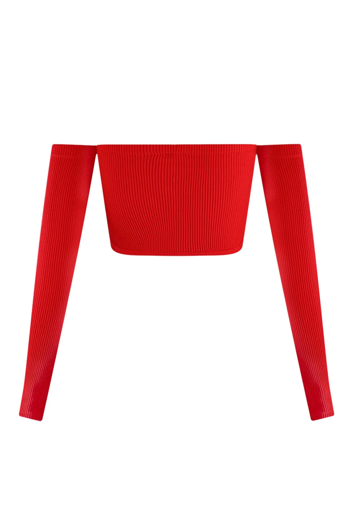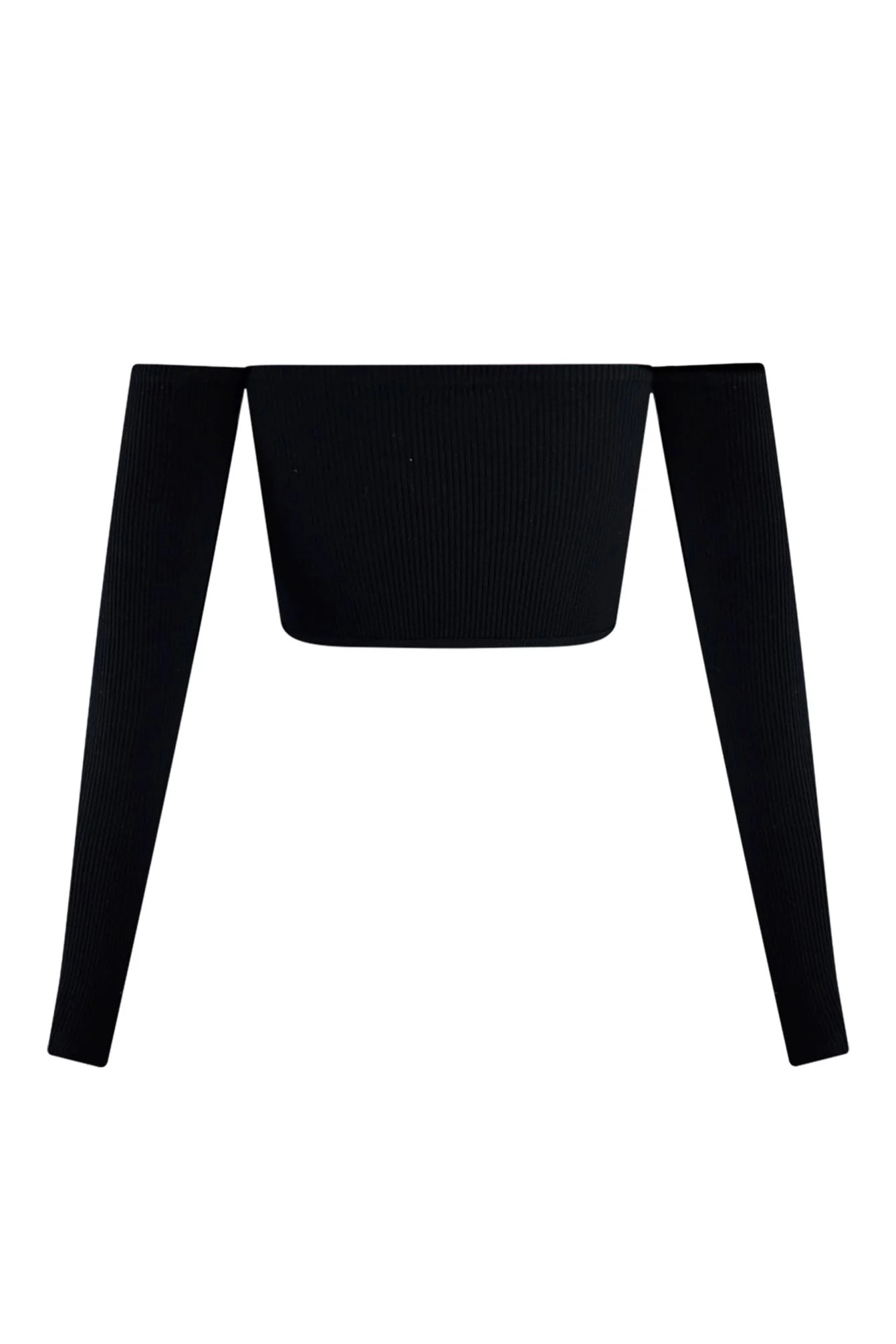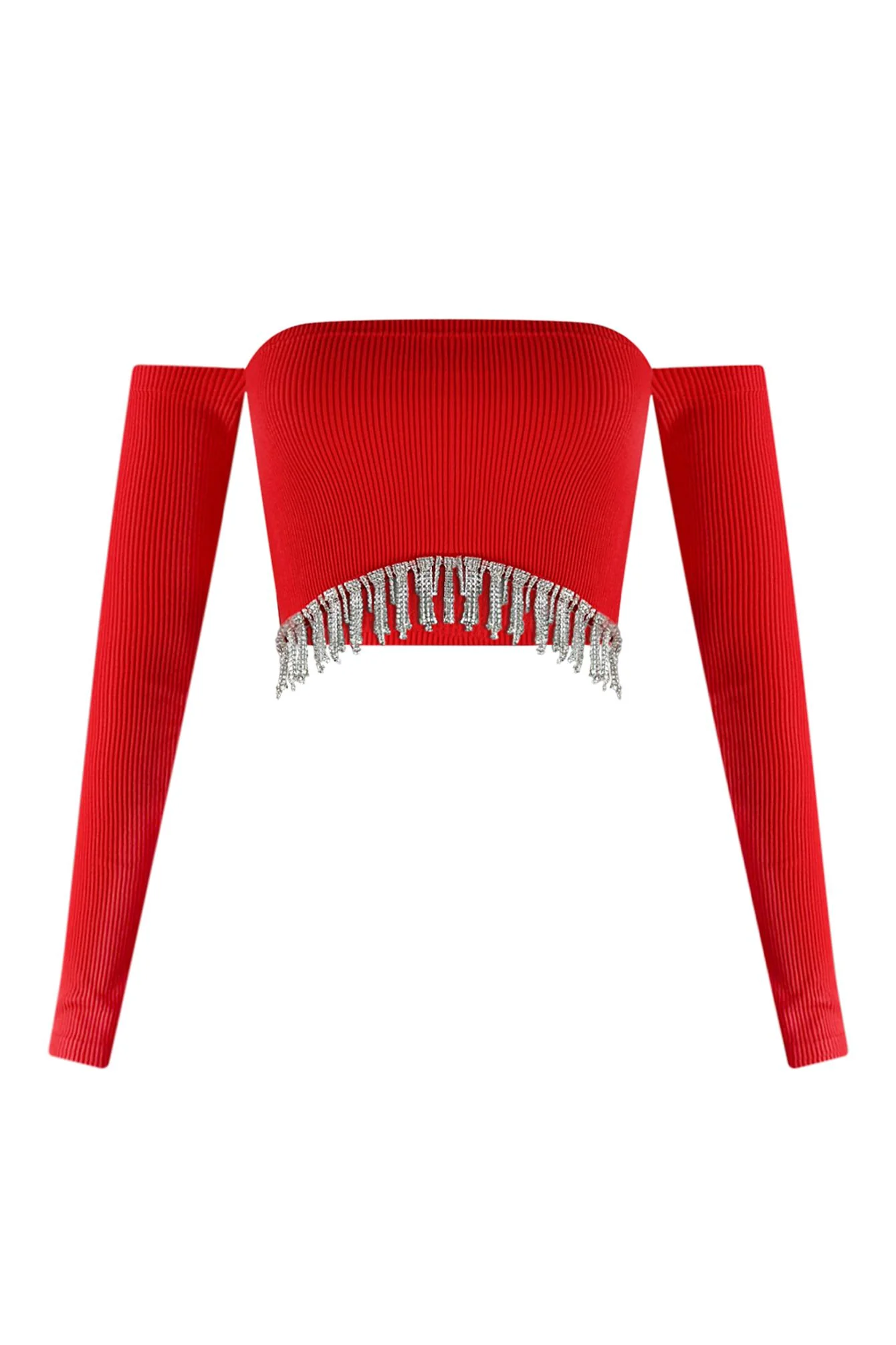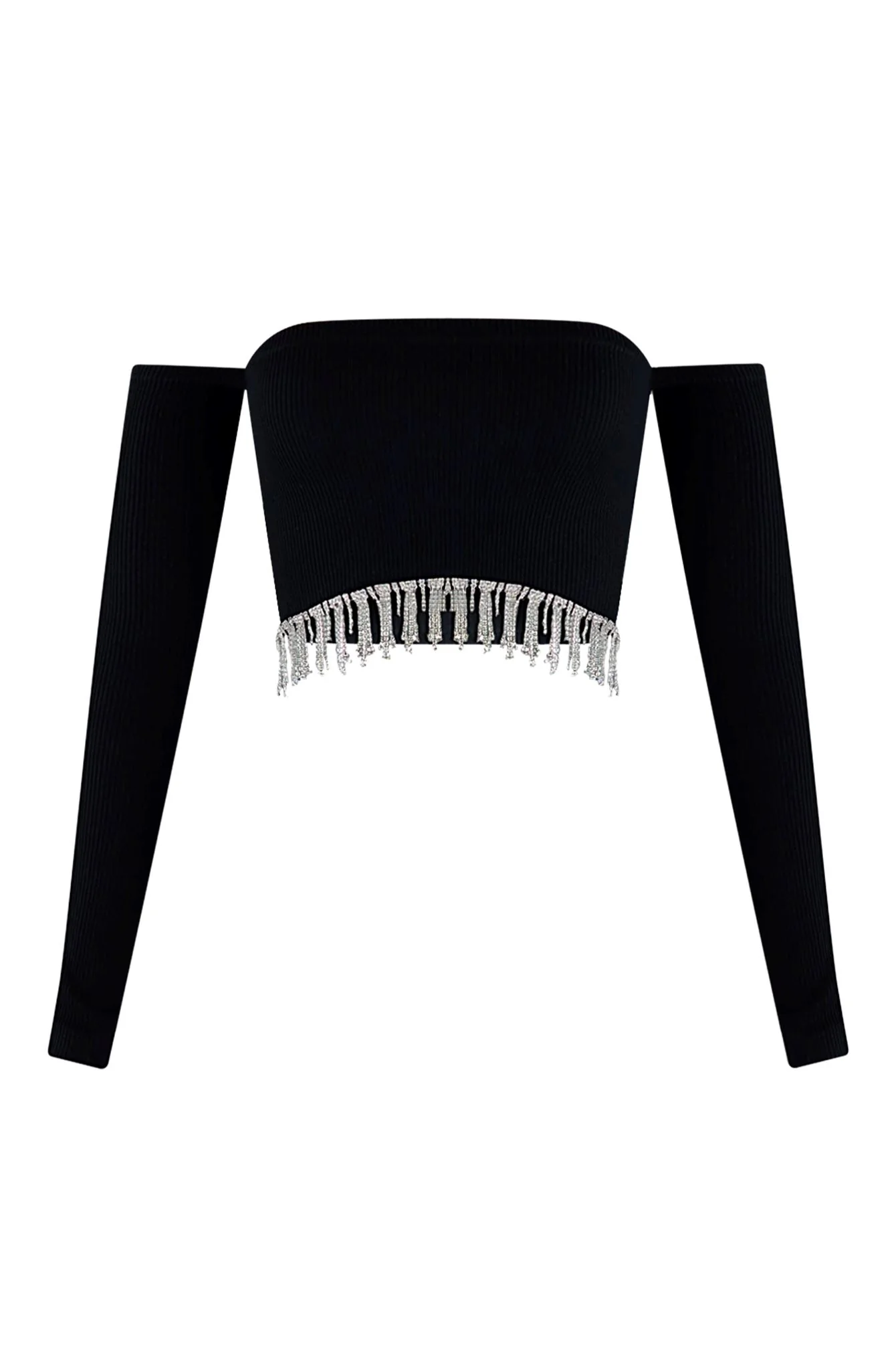 Off shoulder long sleeve cropped knit top featuring rhinestone fringe detail
