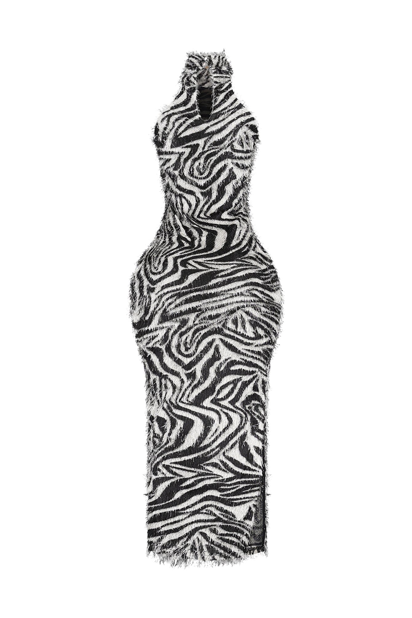 Zebra printed mock neck maxi dress featuring frayed yarn details for an elegant look