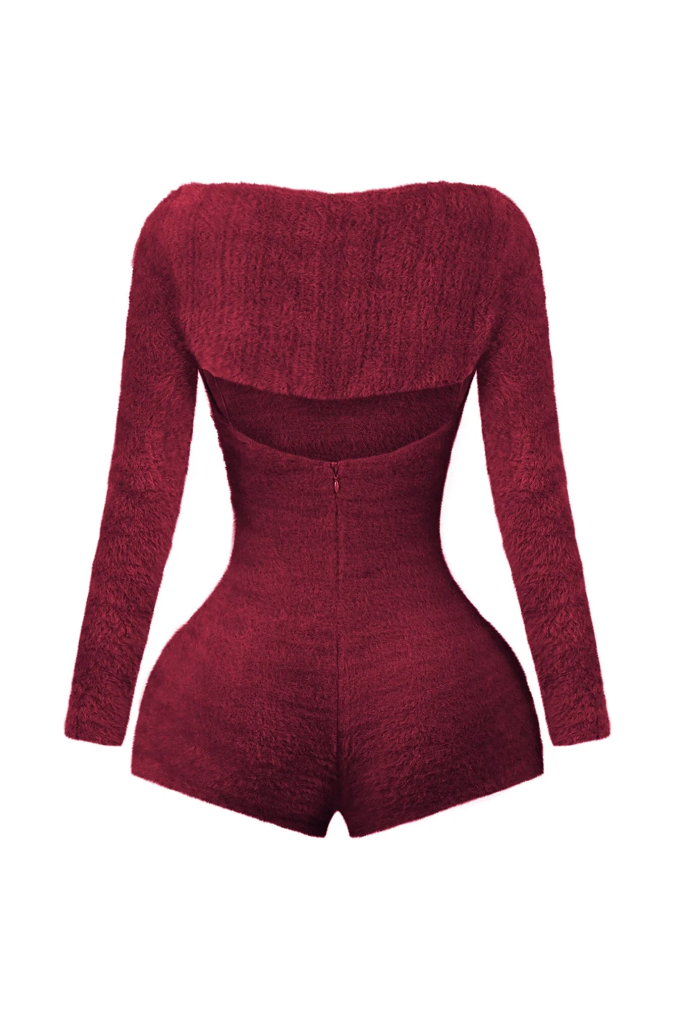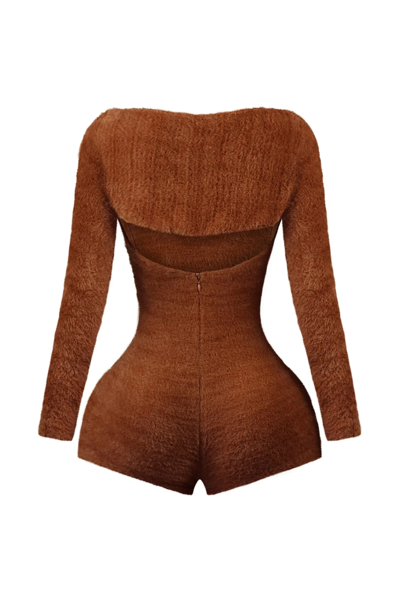 Fuzzy knit sleeveless romper featuring a bustier design with a velvet bow