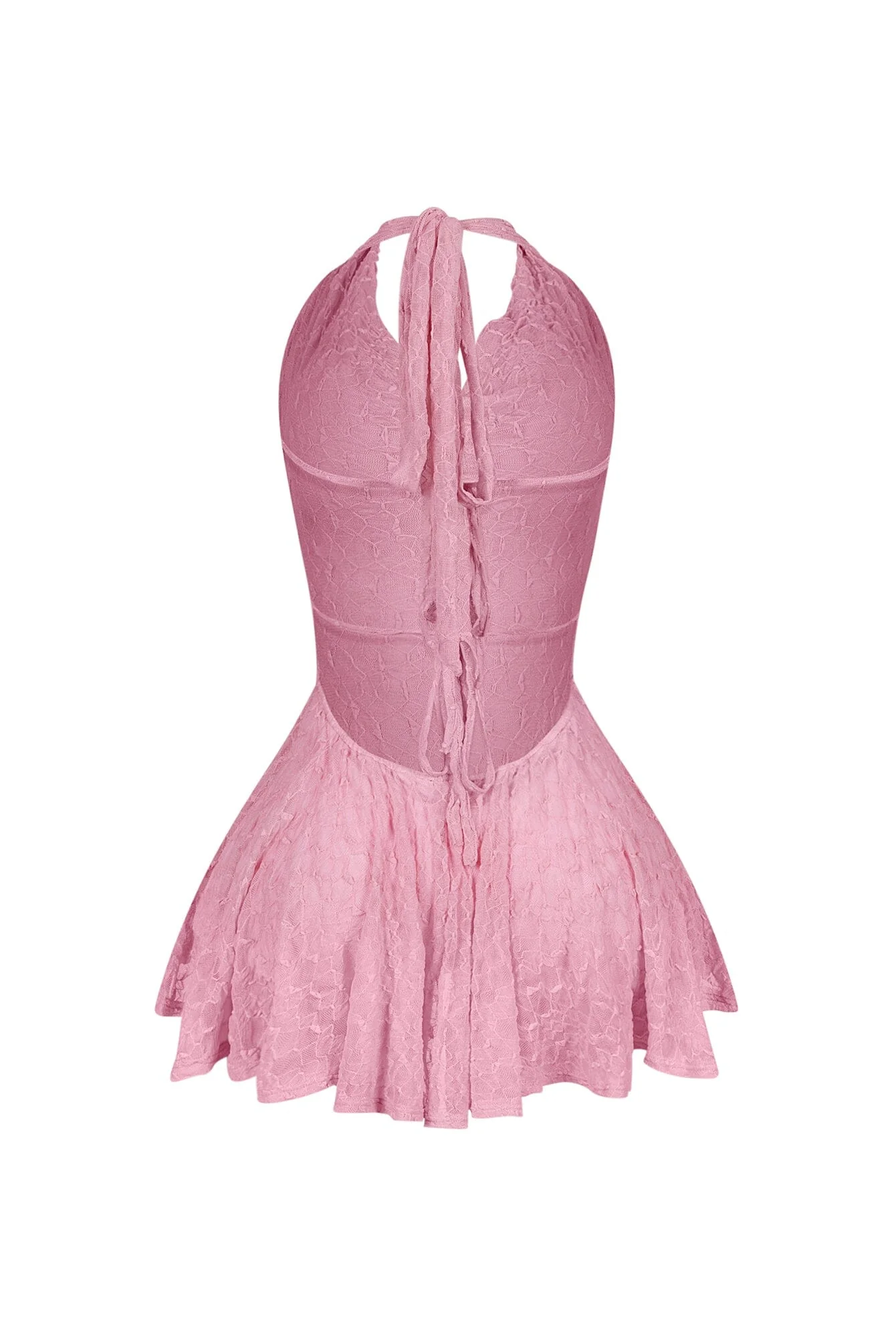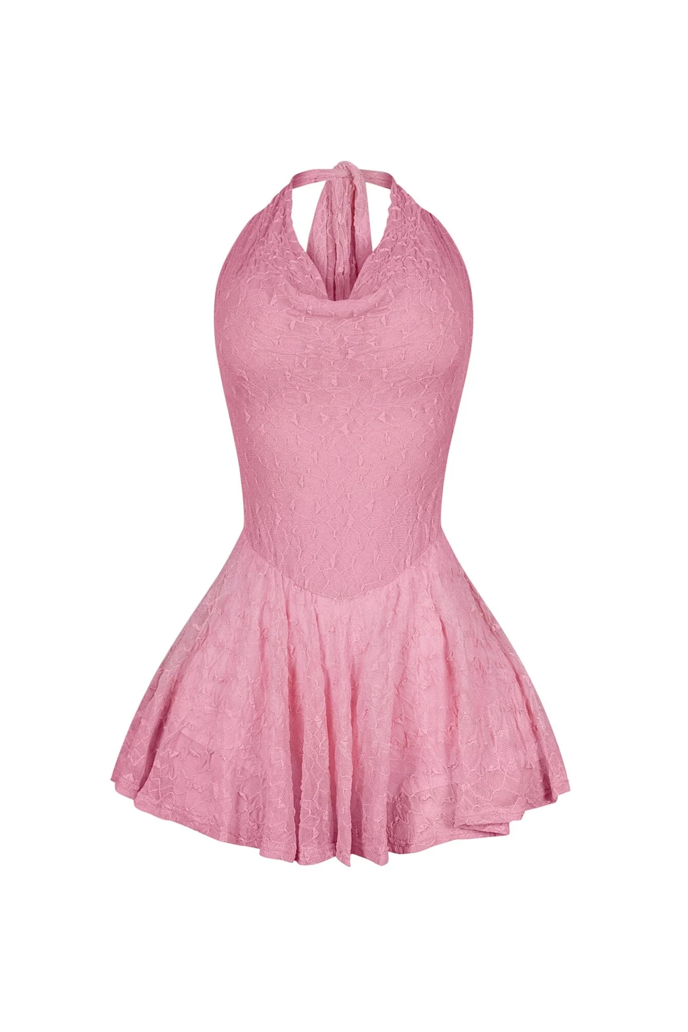 Lace halter cowl neck mini dress featuring flare bottom and an open back