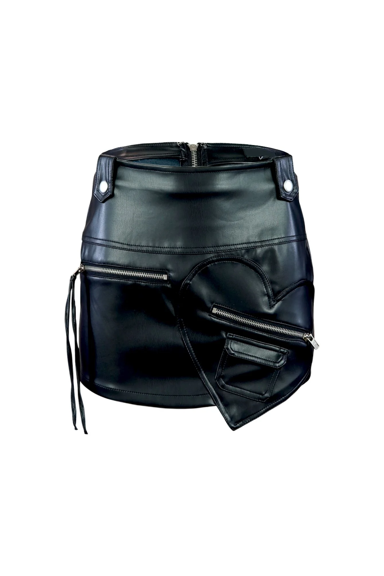 Mid rise faux leather mini skirt featuring front heart pocket and zippers detail