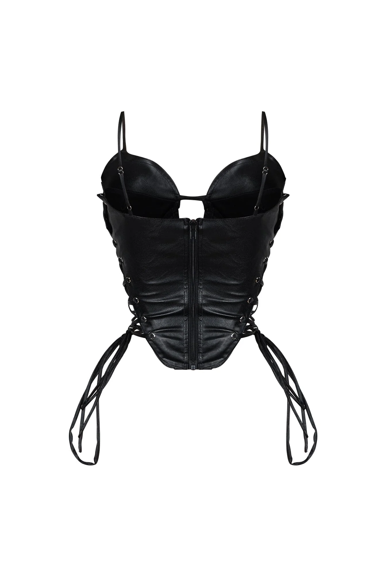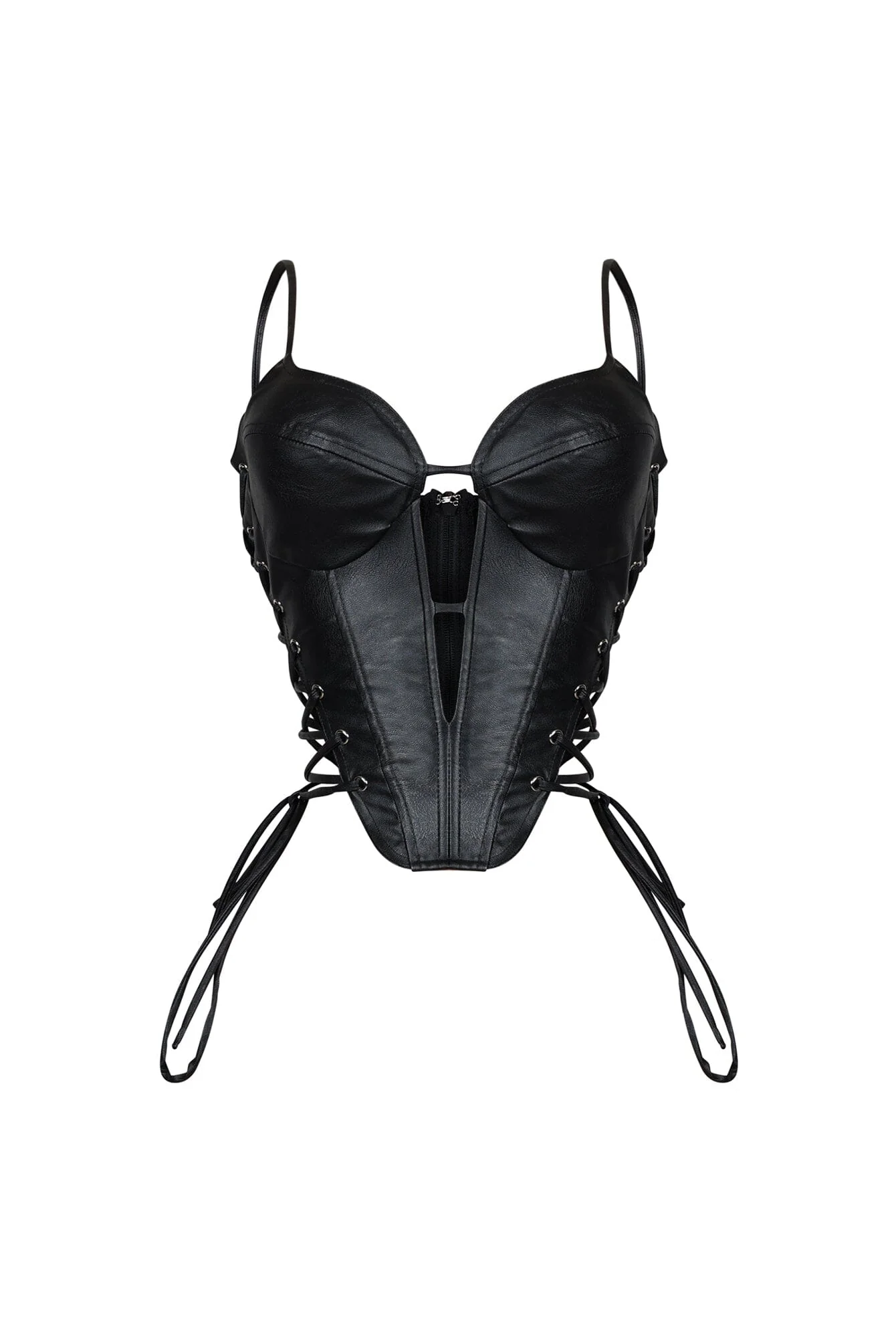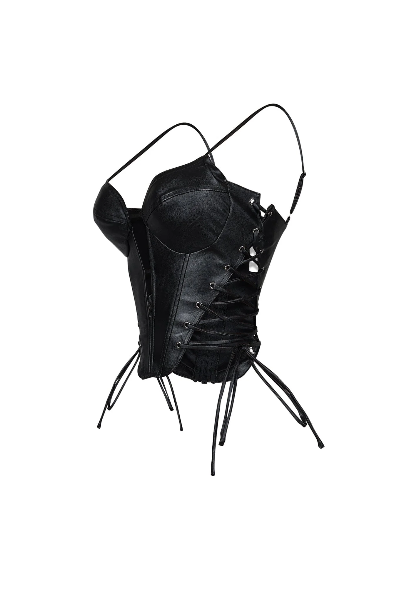 Faux leather tank adjustable padded bustier top featuring side lace up details