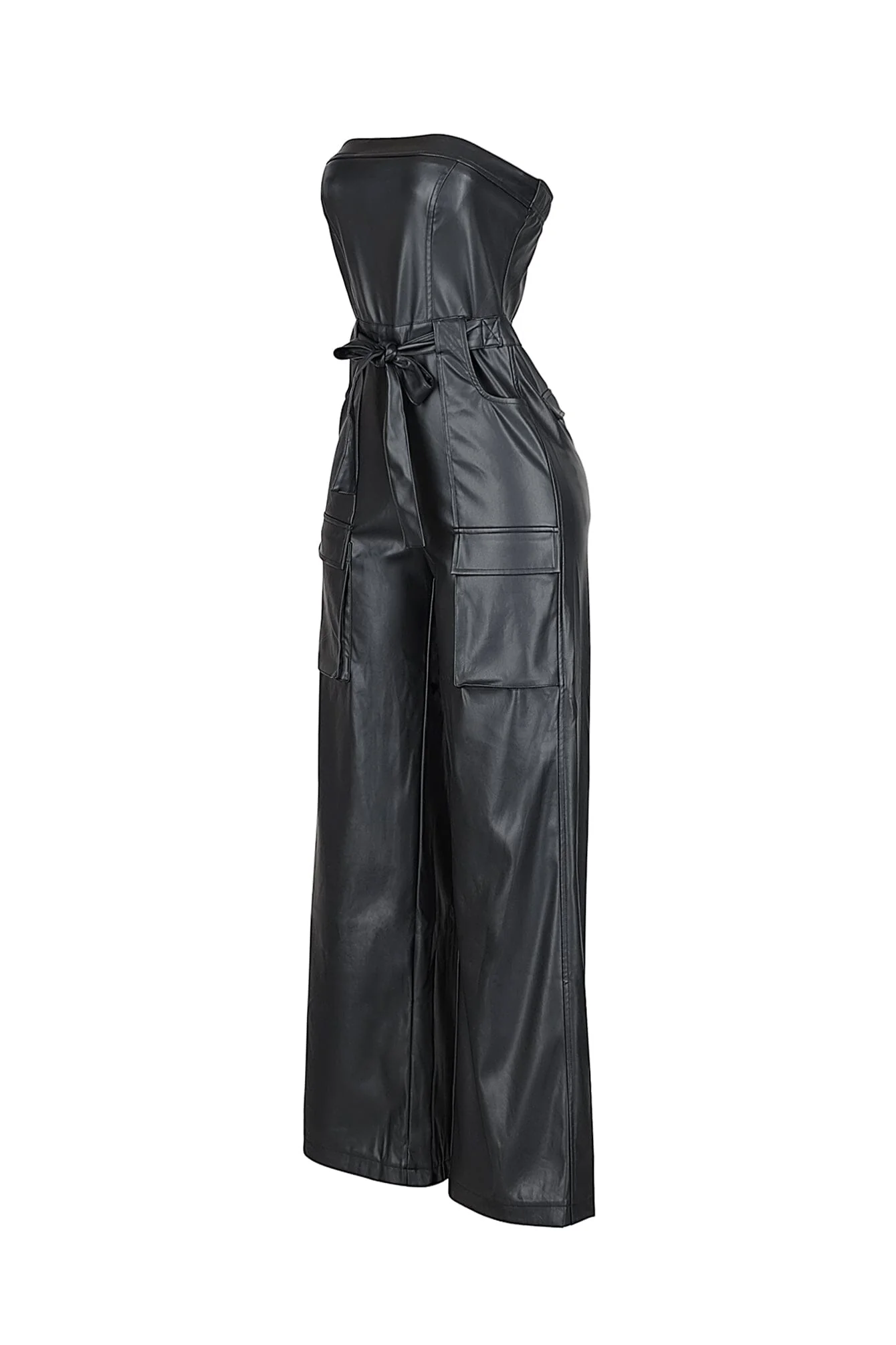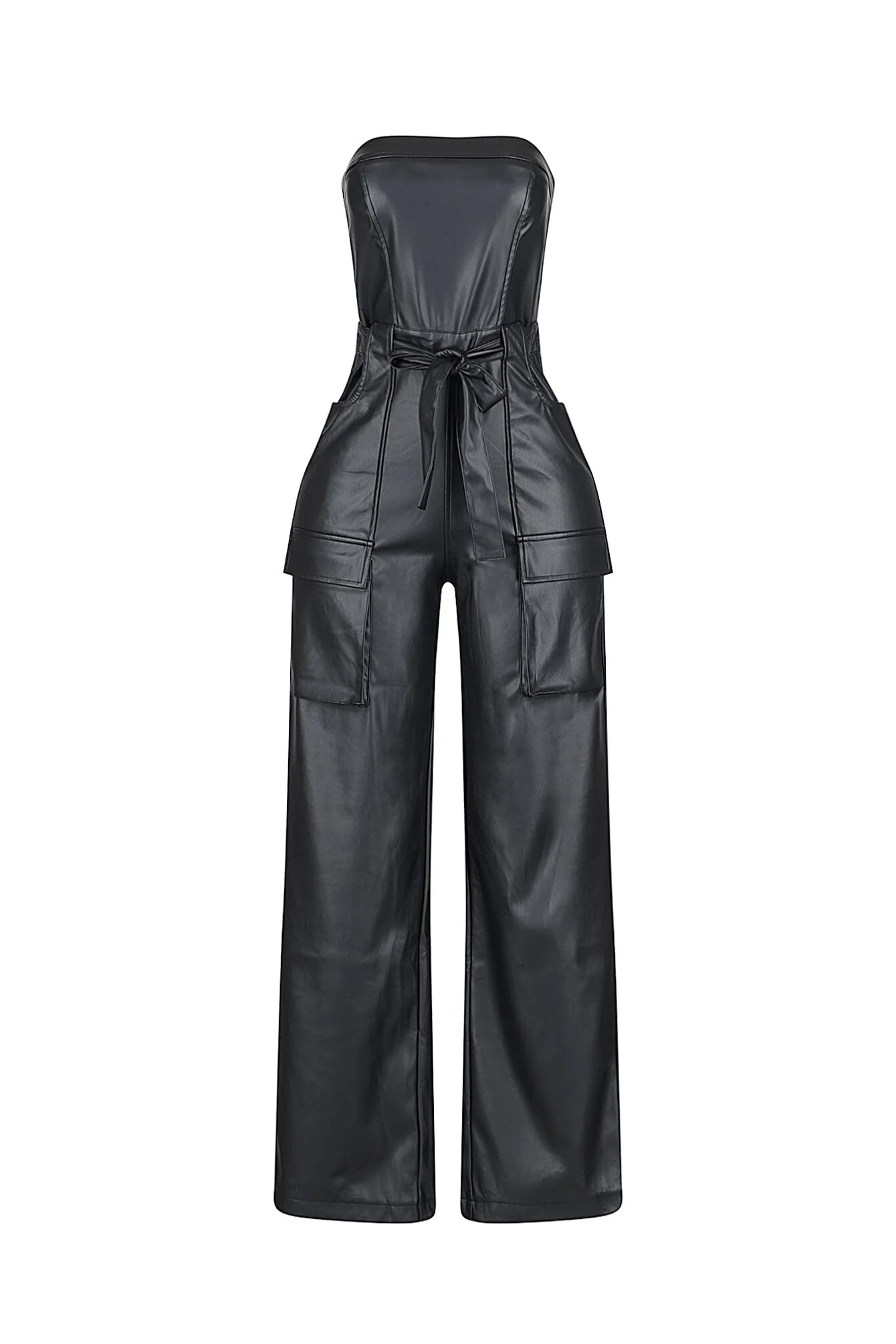 Strapless PU cargo jumpsuit featuring cargo pocket details and a leather tie at the waist