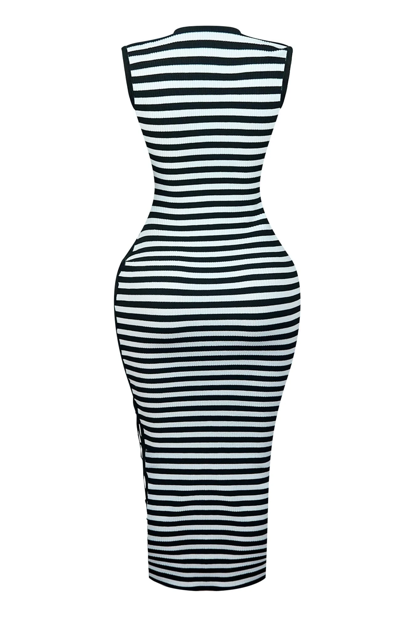 Sleeveless stripe v neck maxi dress featuring side lace up eyelet