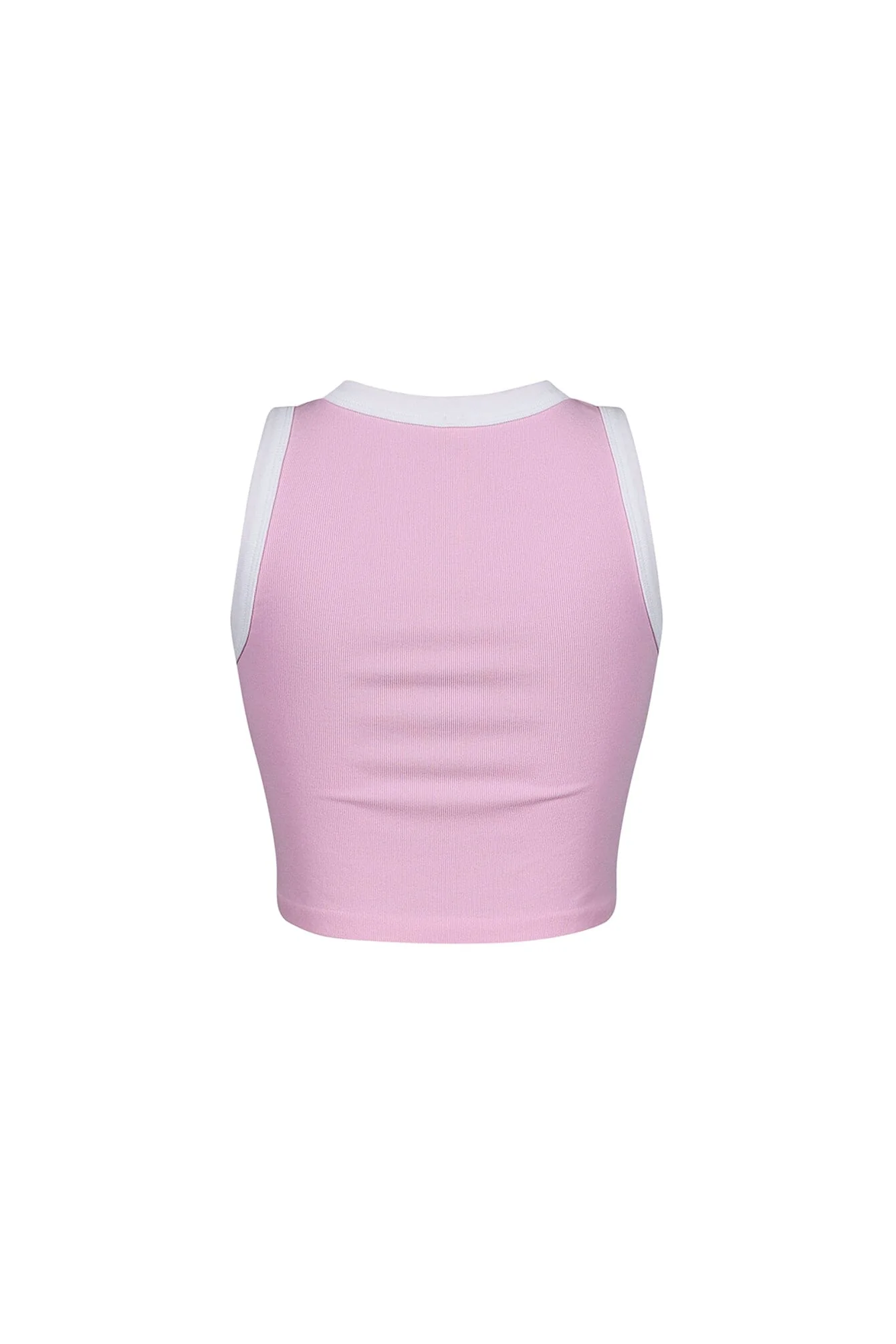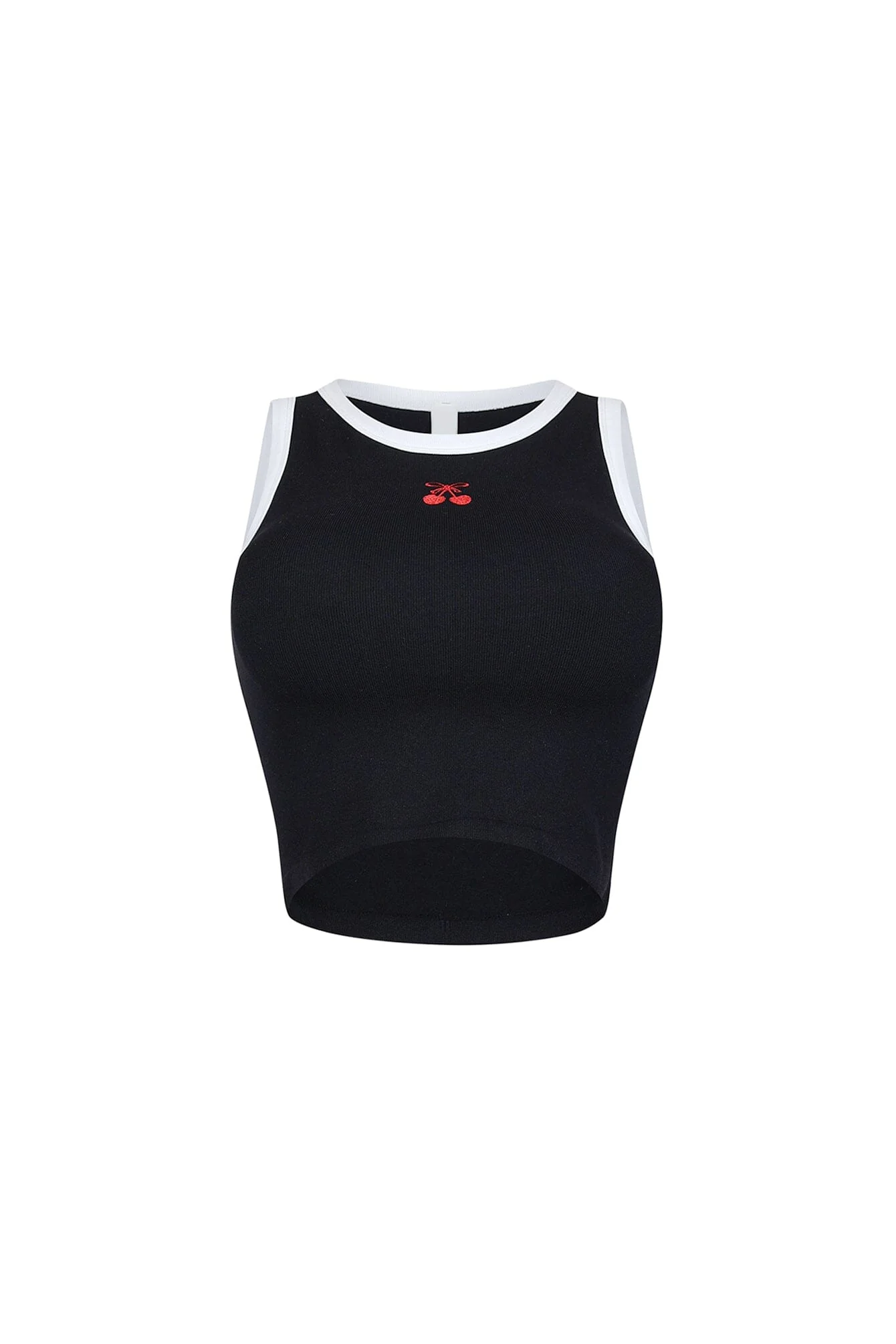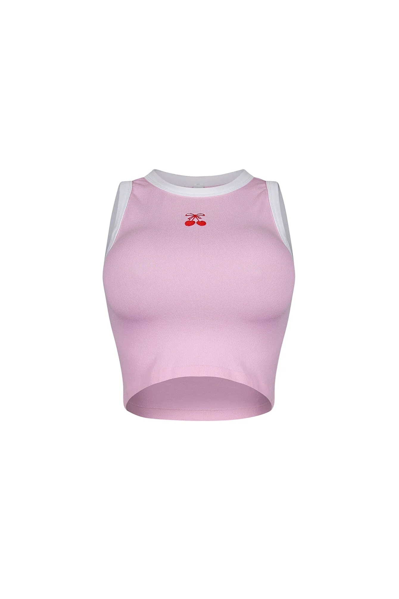 Cherry print crew neck knit cropped tank top featuring an embroidered design