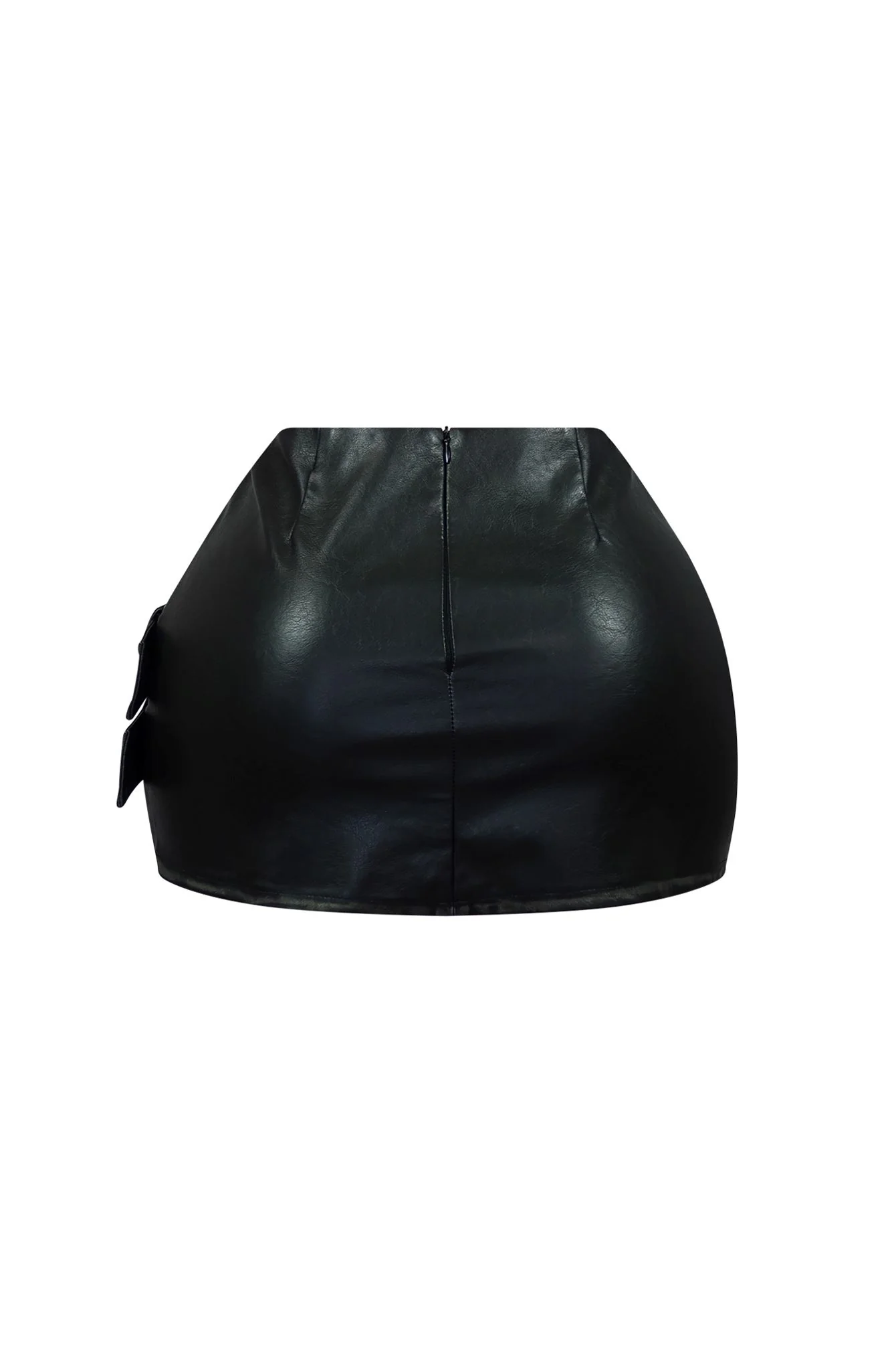 Mid rise faux leather mini skirt featuring attached diagonal belts
