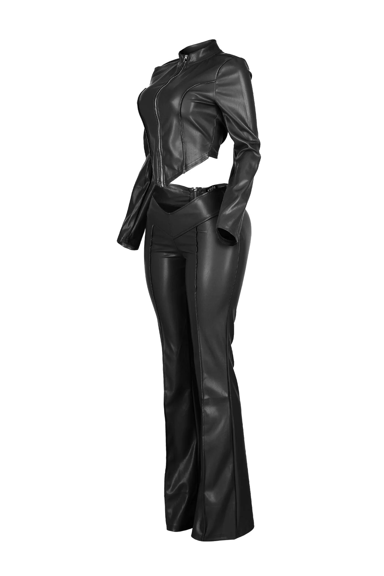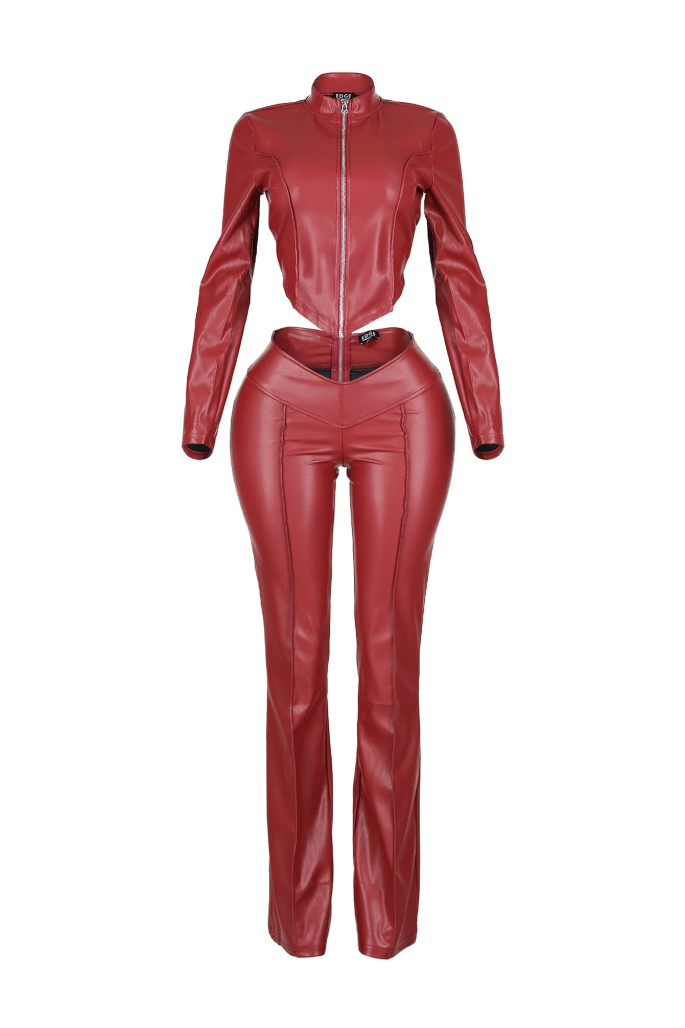 Matching high rise pants set featuring a V shaped front hem at the waist