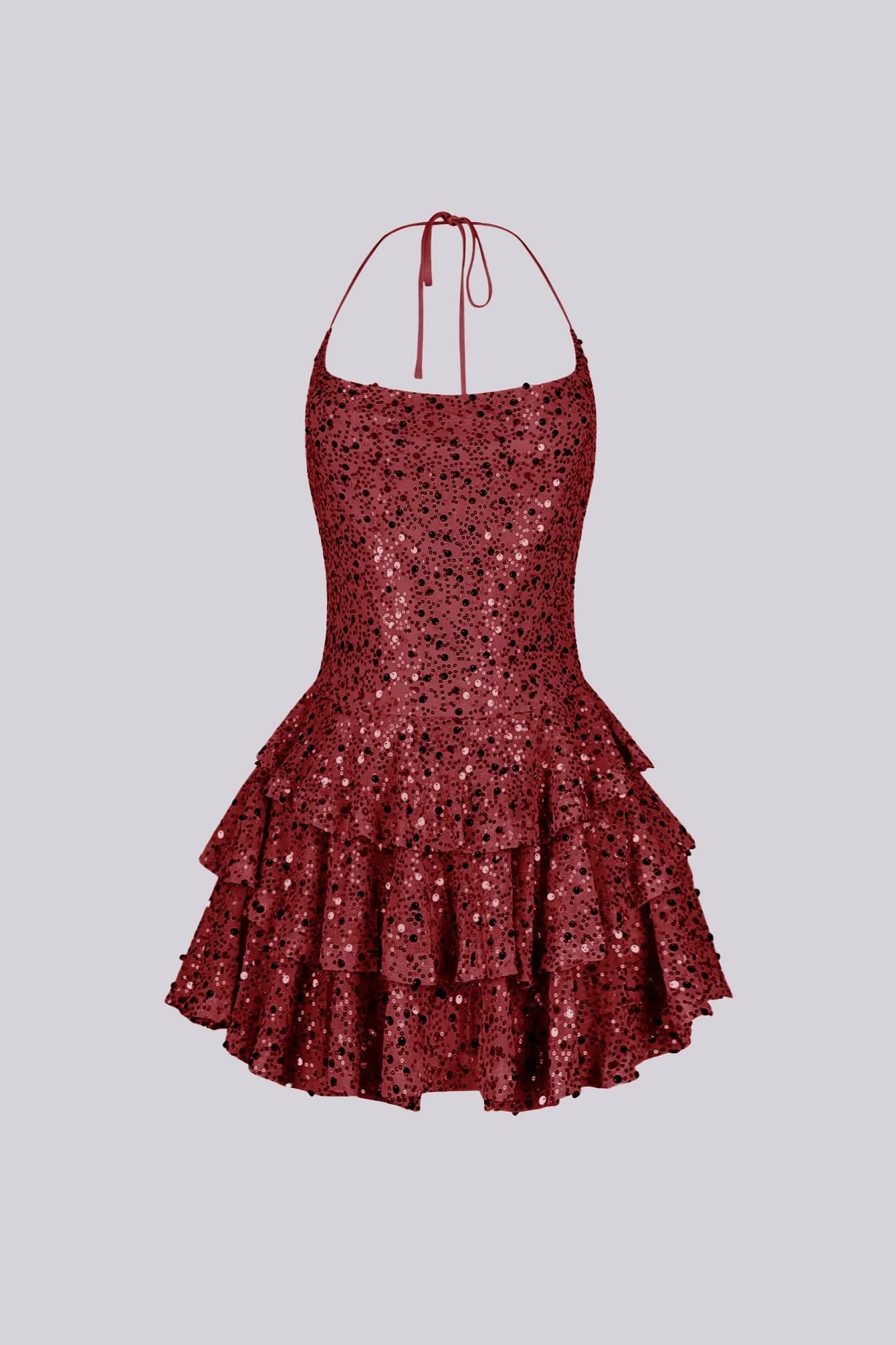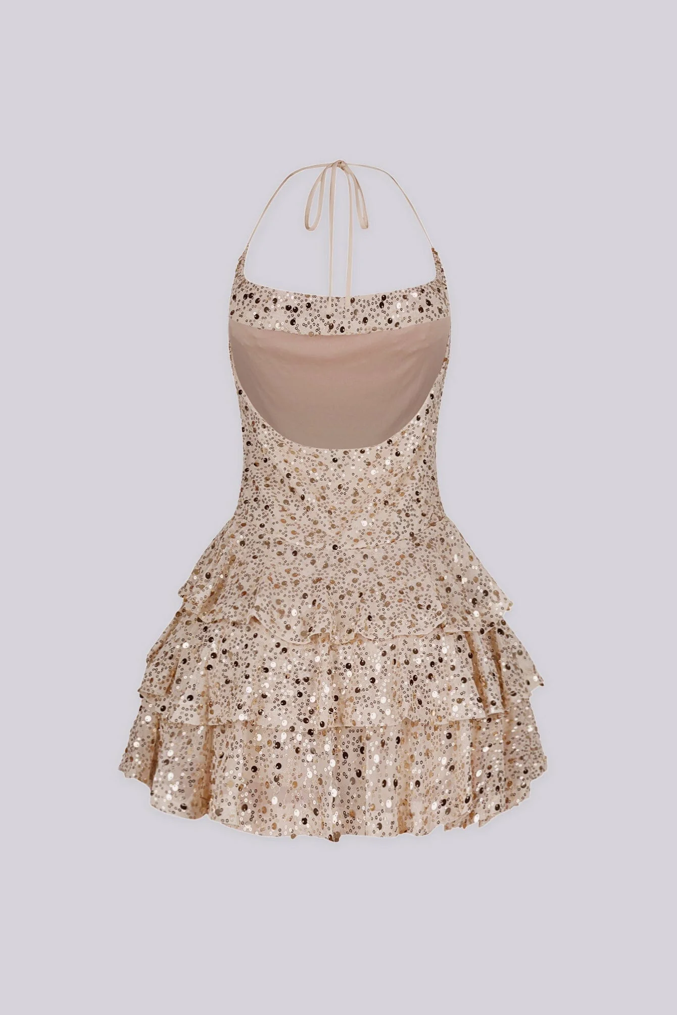Sleeveless open back halter mini dress featuring ruffle layers and all over sequins