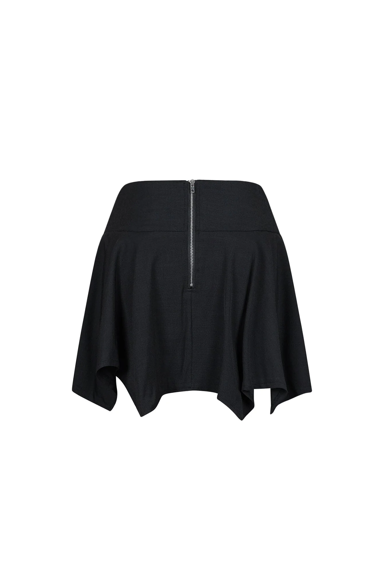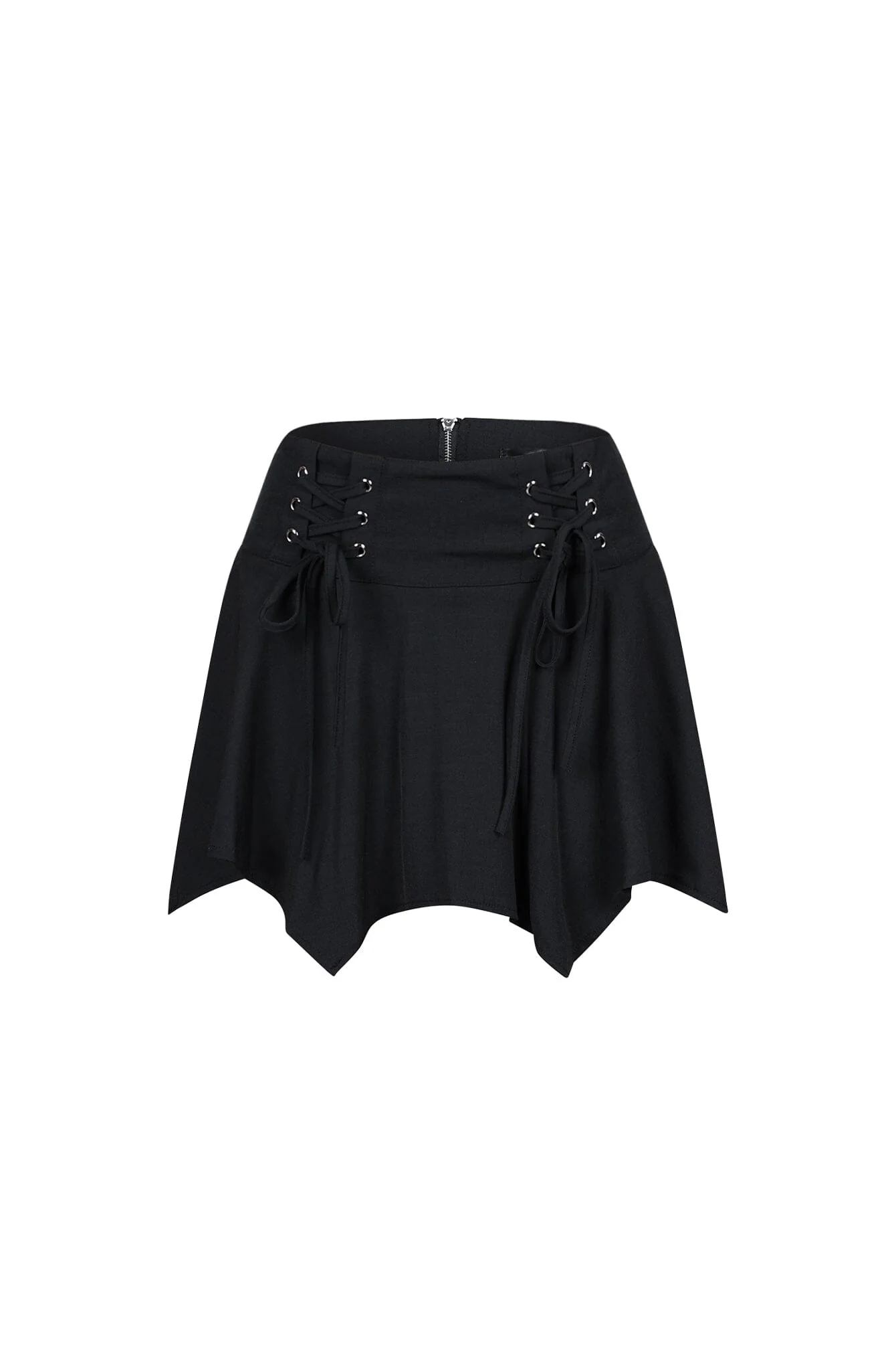 High rise mini skirt featuring an asymmetric hem design and eyelet lace-up details
