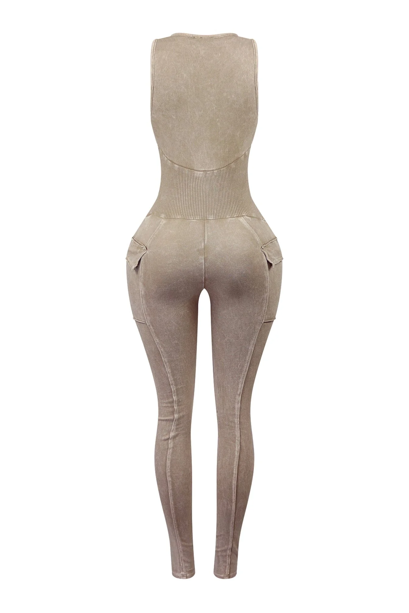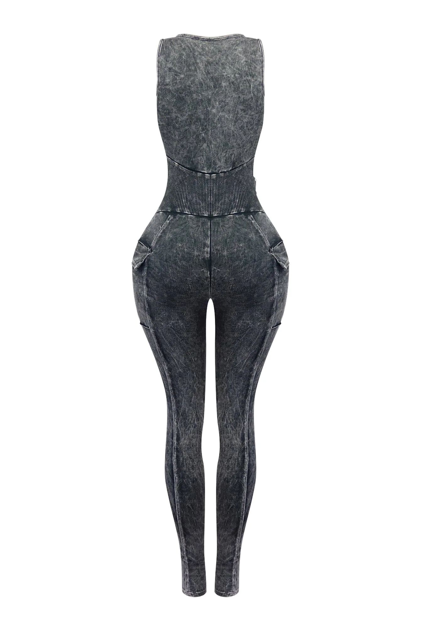 Mineral washed V-neck sleeveless jumpsuit featuring mid corset detail with zip up closure