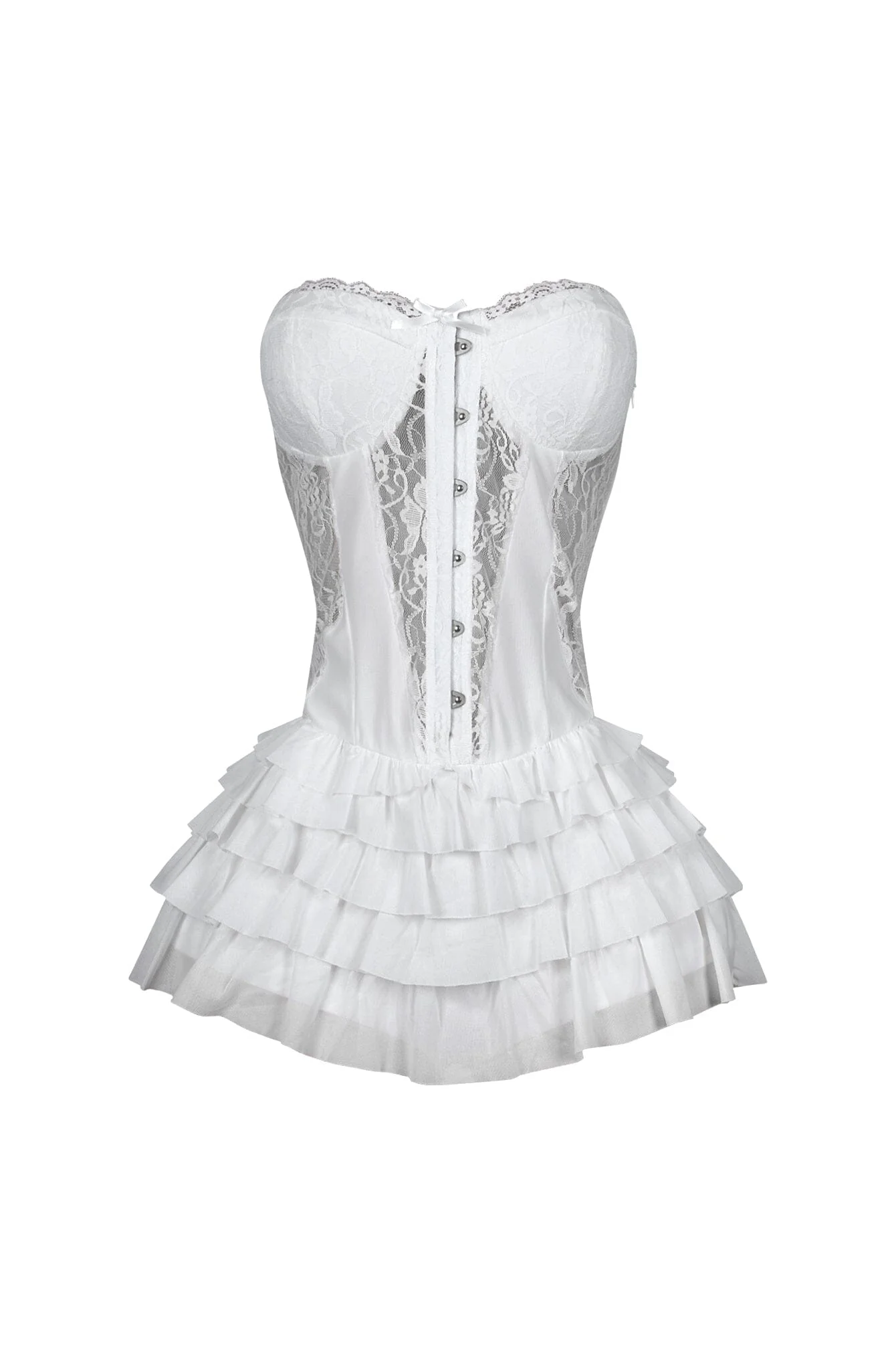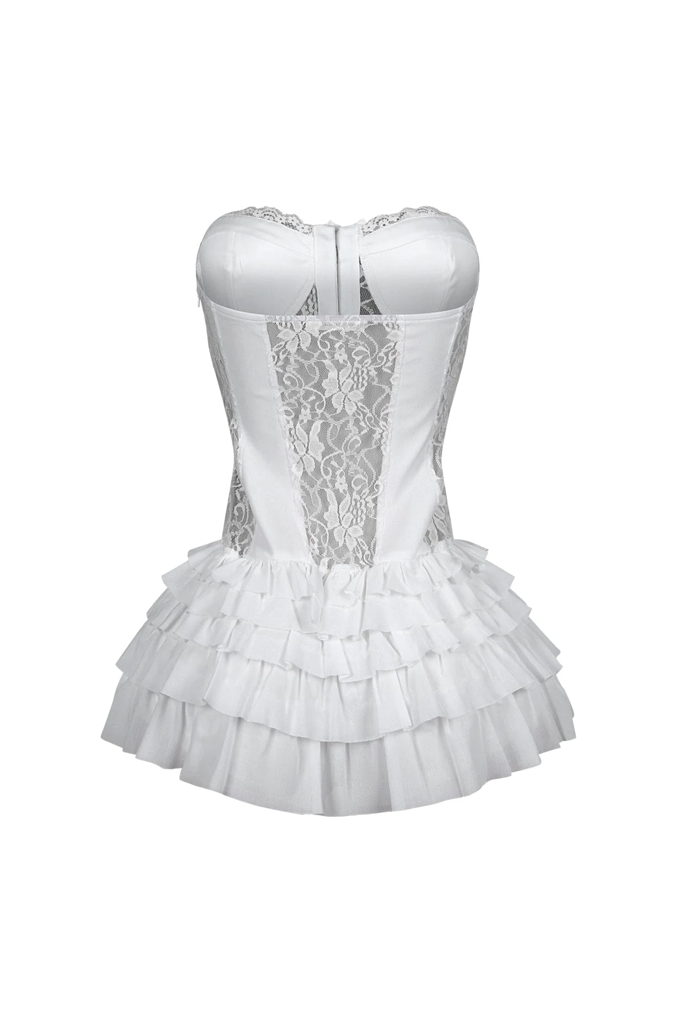 Lace tube padded bustier mini dress featuring ruffle hem and front hook closure