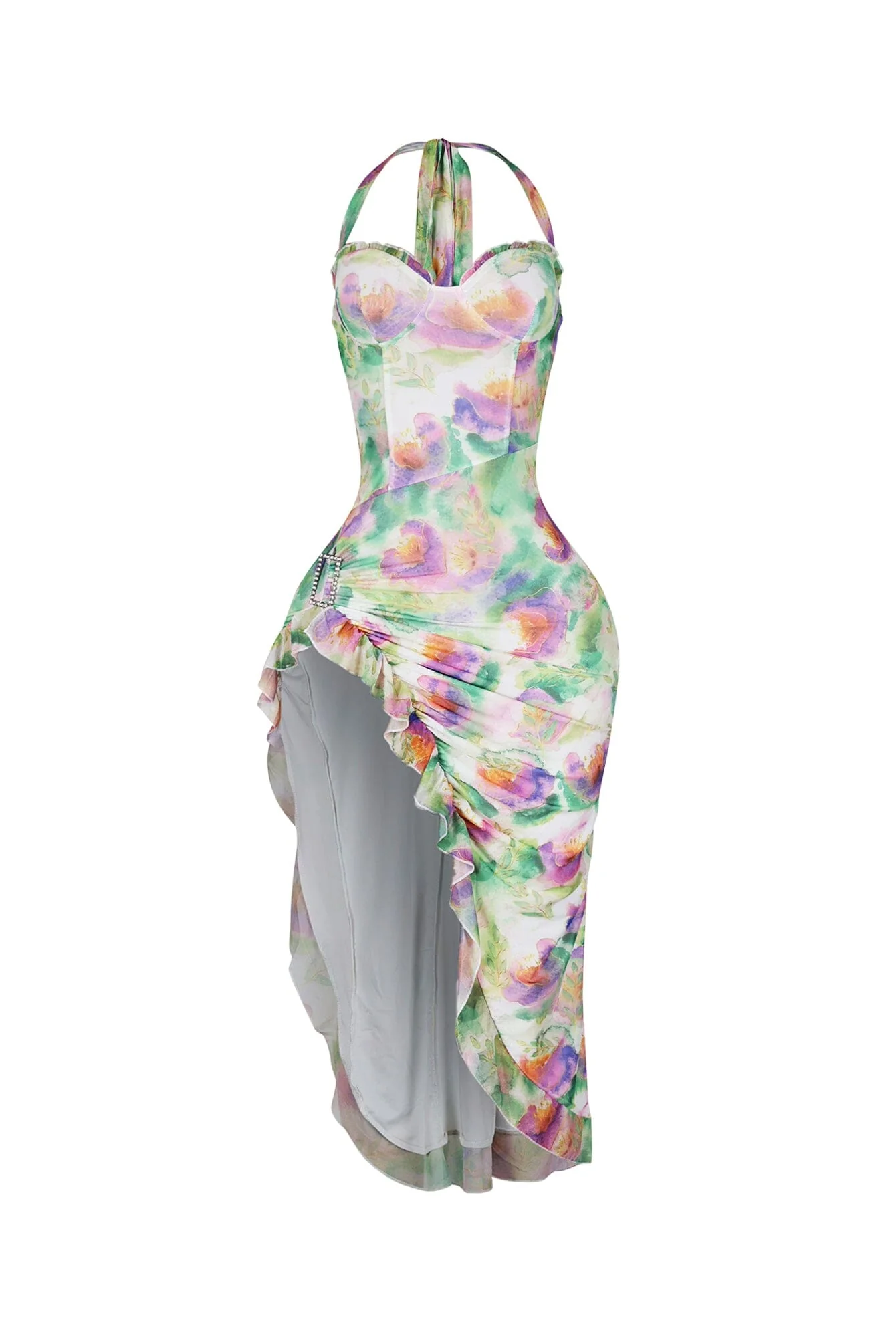 Mesh printed halter bustier midi dress featuring asymmetrical ruffle hem slit with rhinestone detail
