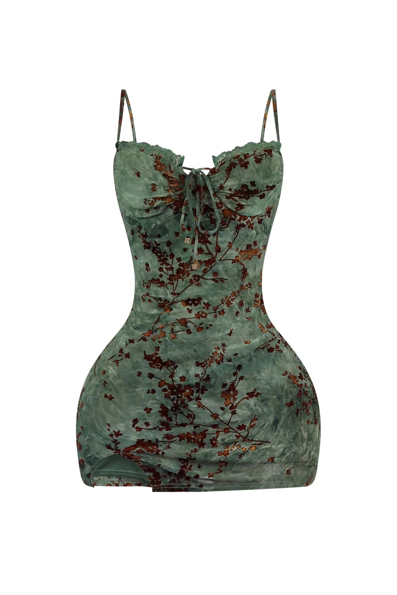 Cami mini dress featuring a burnout design and bustier cups with lace trim details