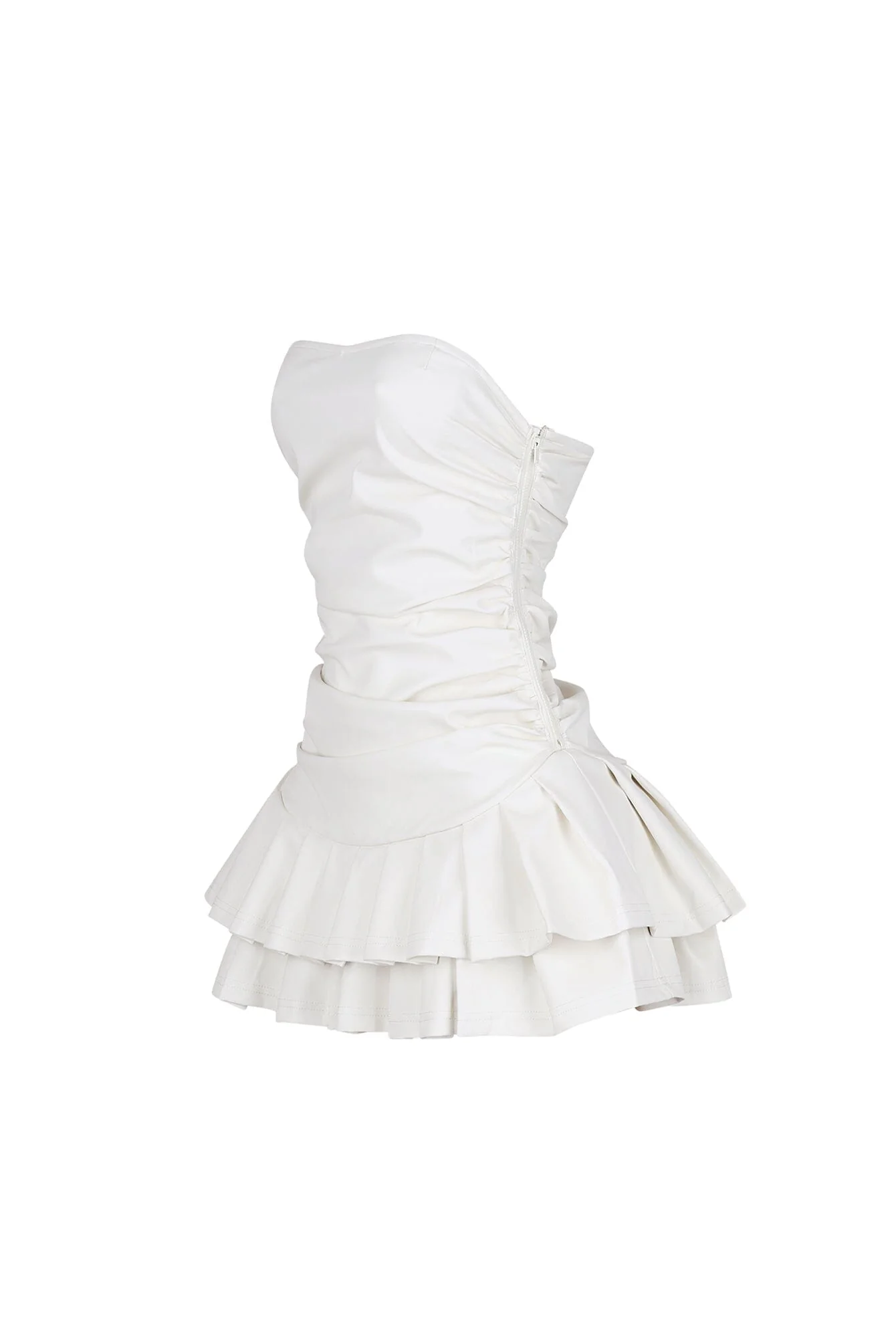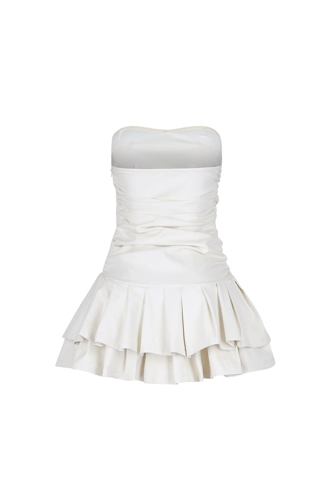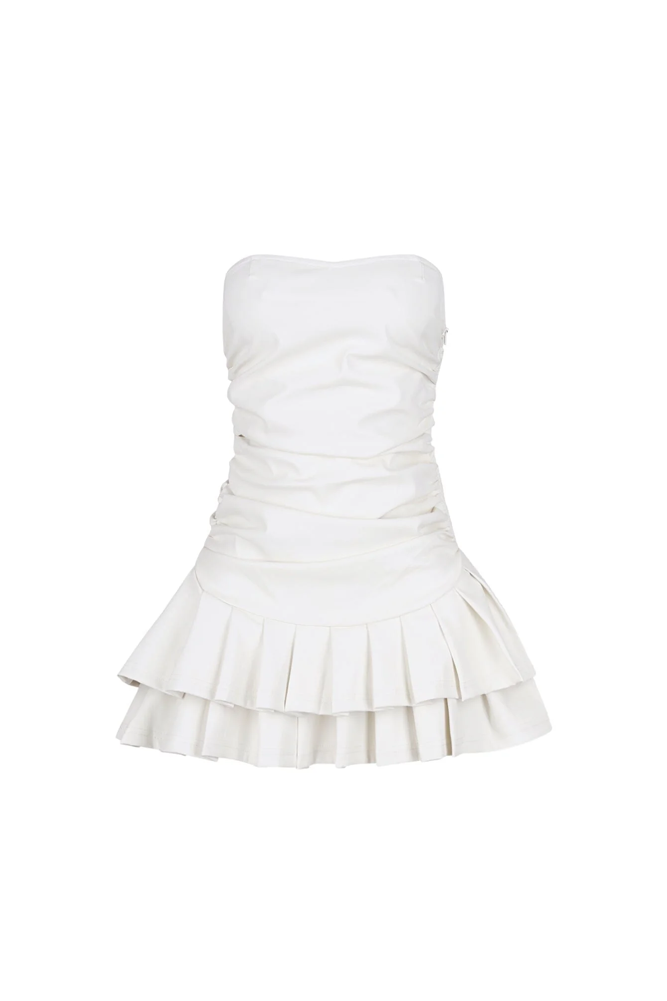 Strapless faux leather mini dress featuring ruching and a pleated flare hem