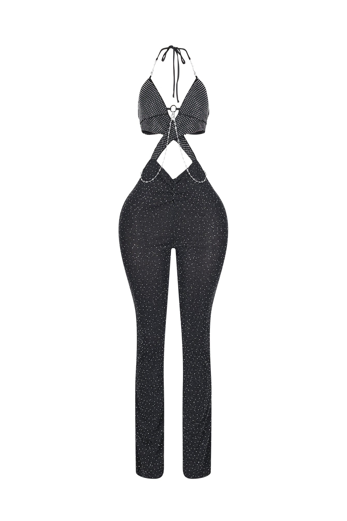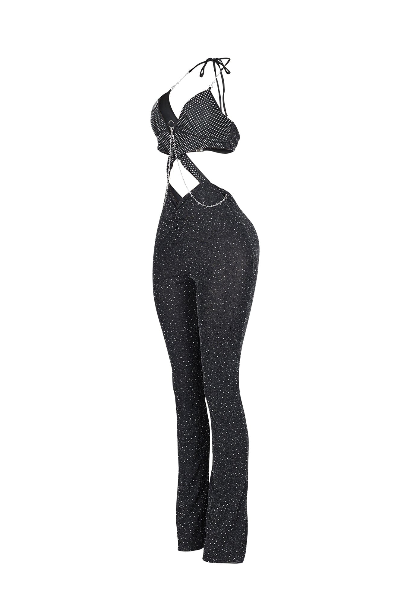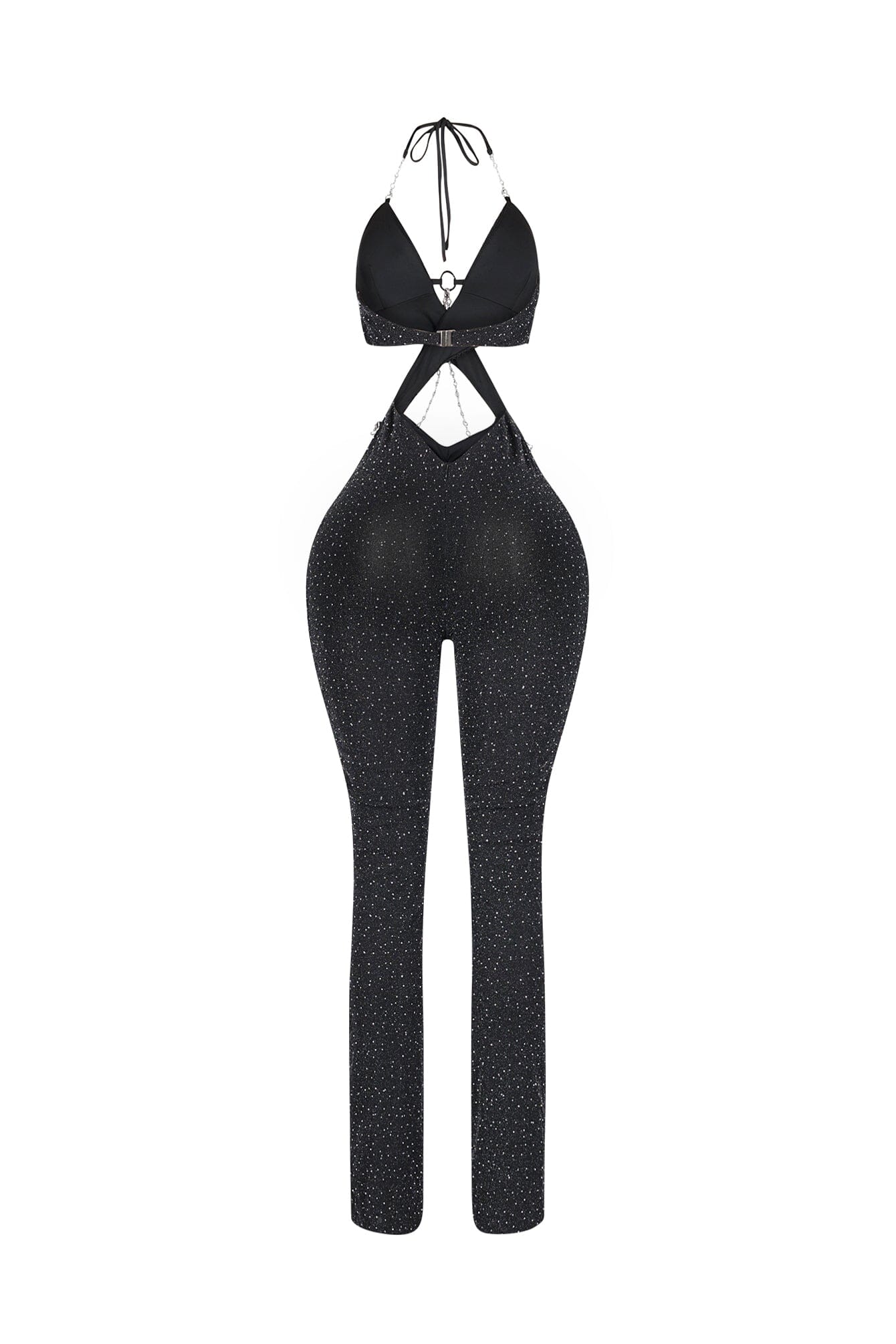 Halter neck rhinestone jumpsuit featuring all over rhinestone embellishments and chain details