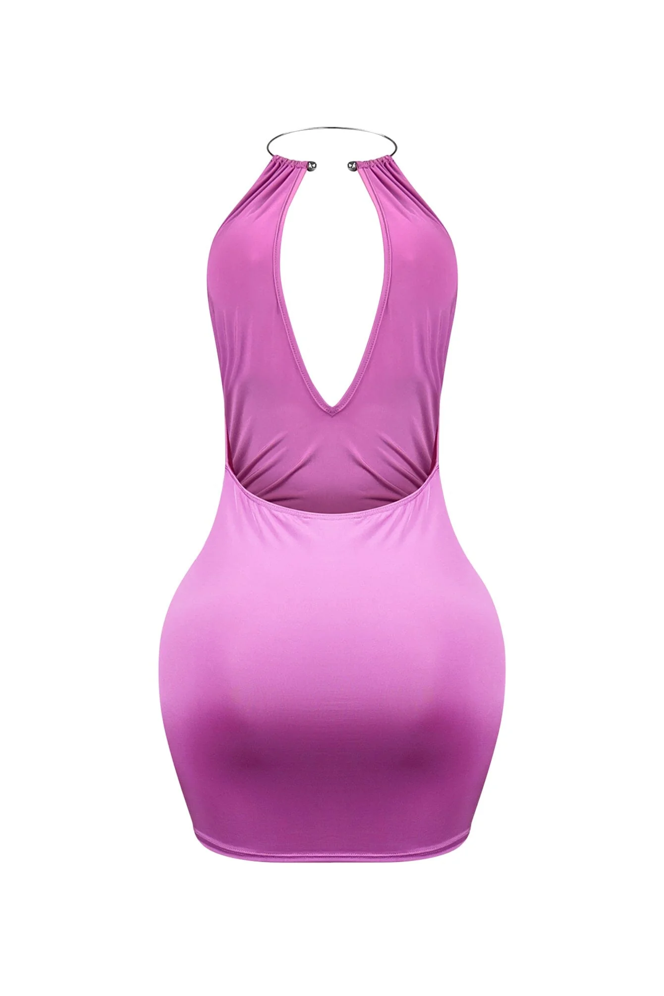 Ruched mini dress featuring a deep V neckline and metal choker
