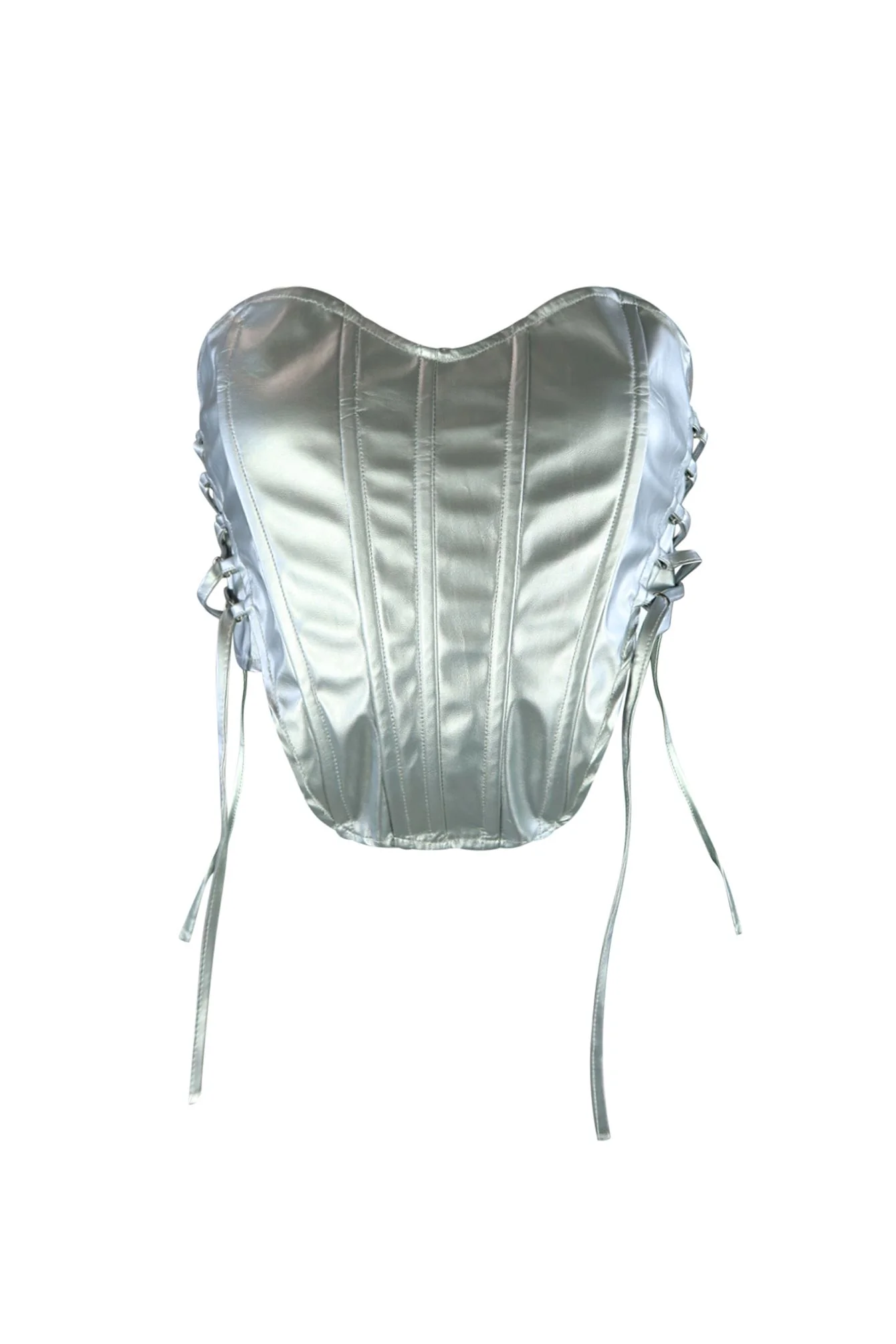 Faux leather bustier top featuring front boning, a sweetheart neckline, and side lace up eyelet detail