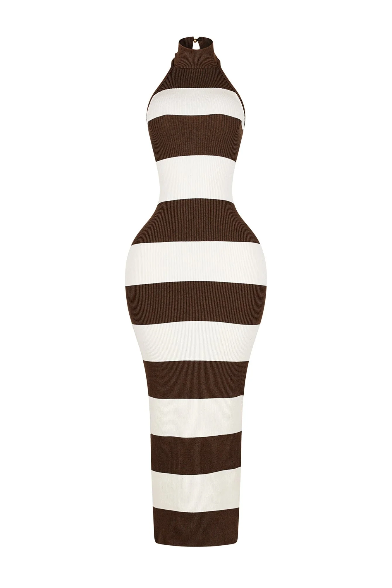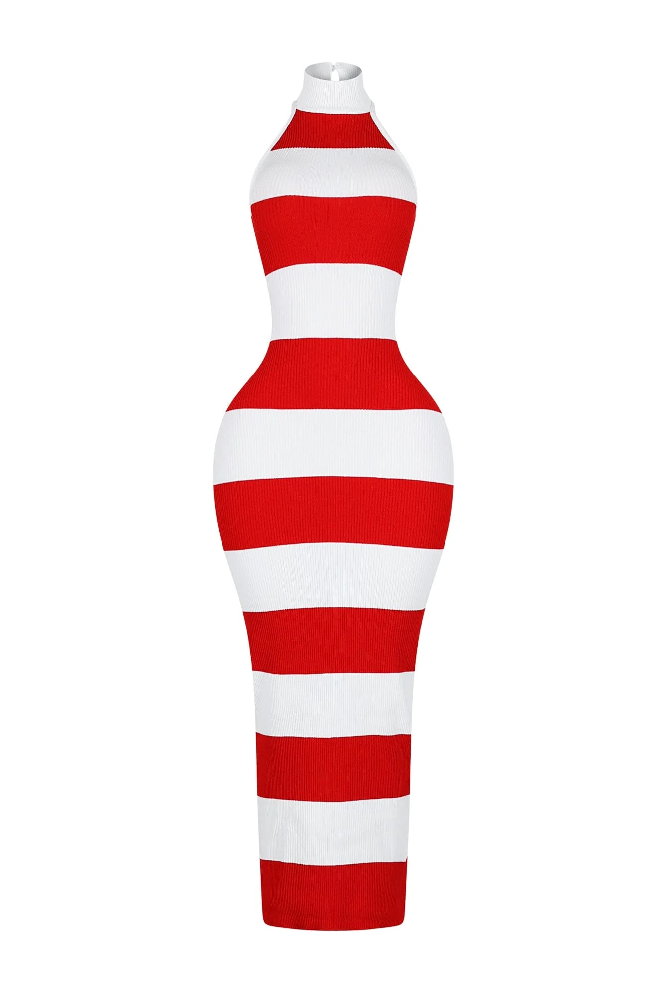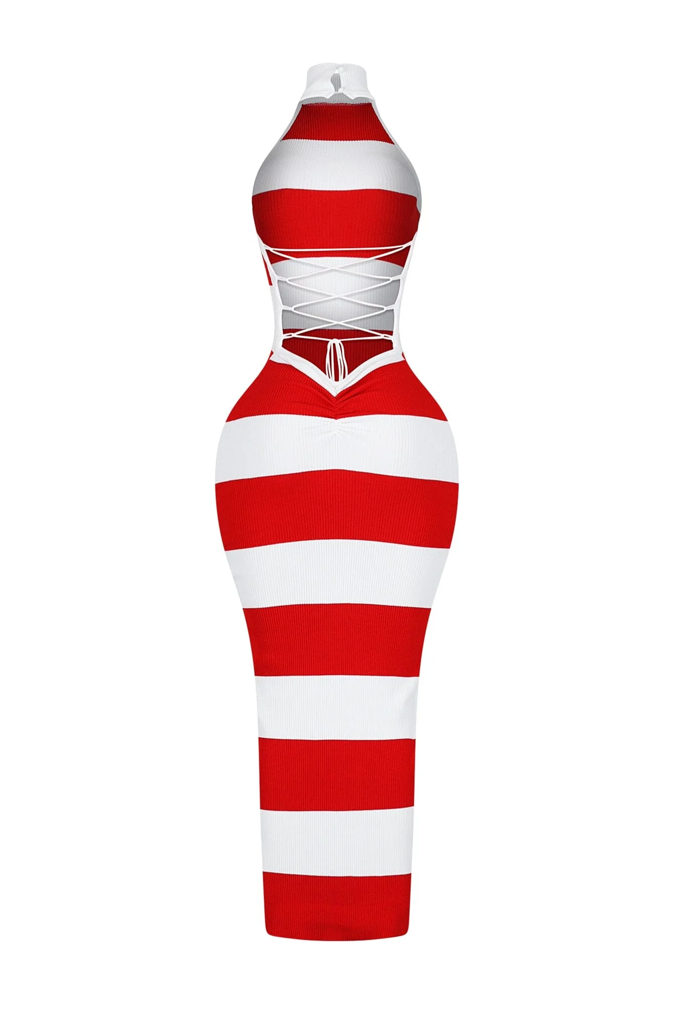 Sleeveless mock neck maxi dress featuring big striped design and back lace up detail