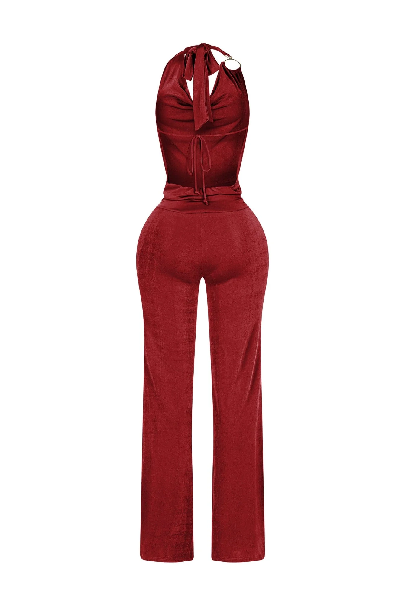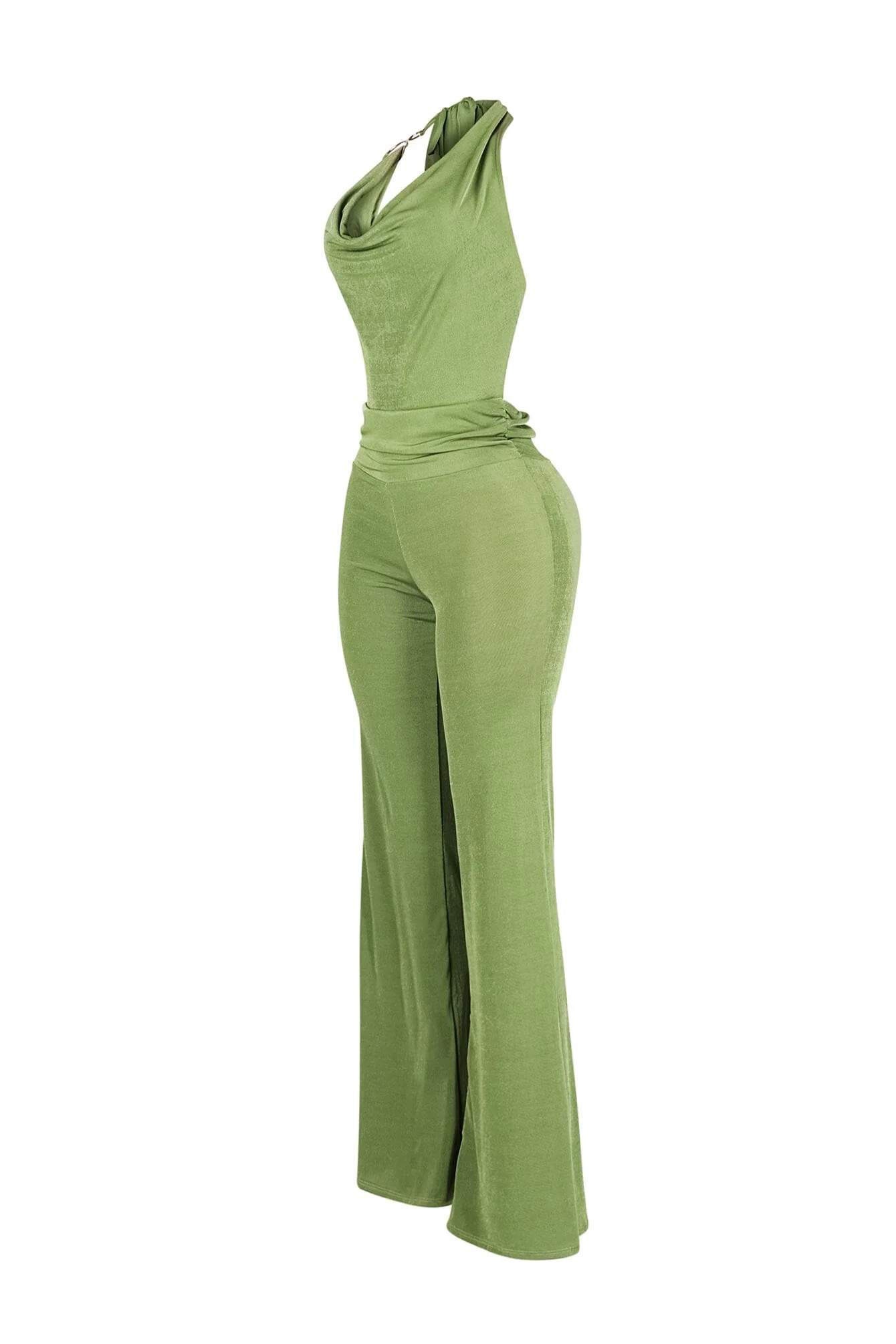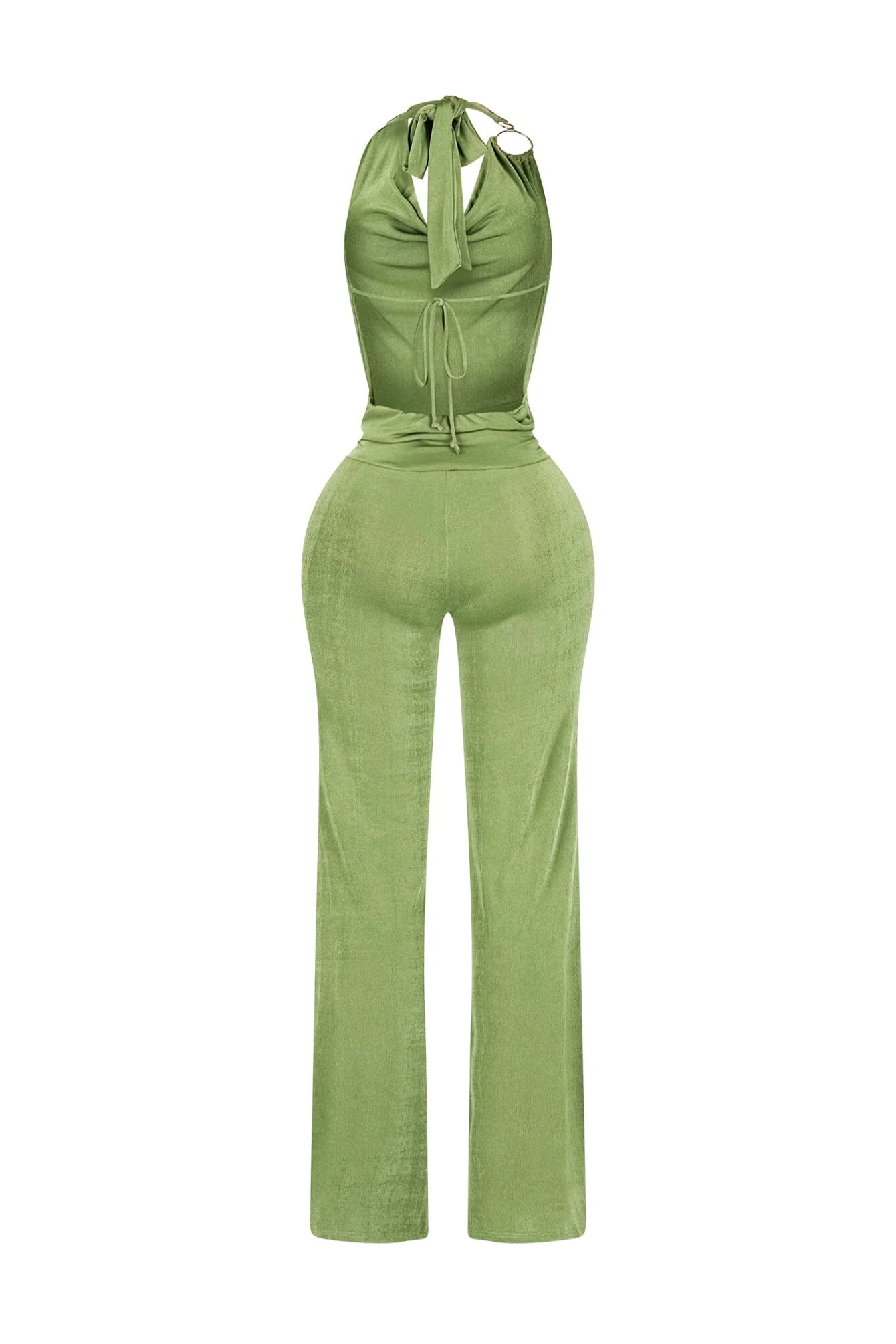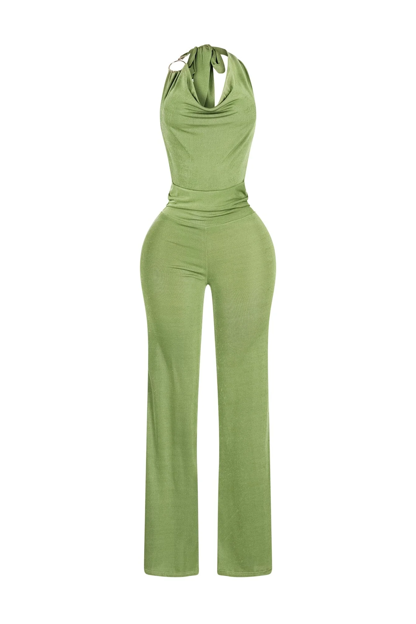 Backless slinky halter jumpsuit featuring cowl neckline and O ring detail
